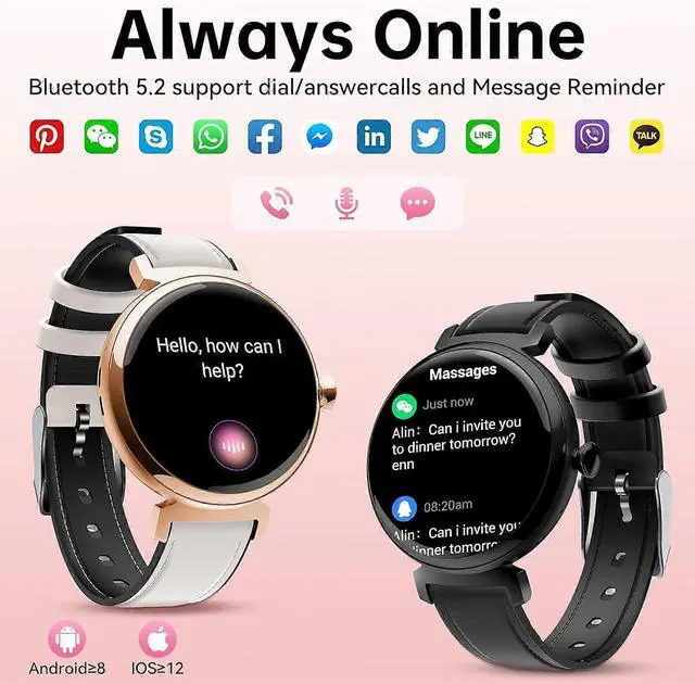 Compatible with iOS 12+ and Android 8.0 +, offering music control, camera shutter, and 200+ customizable watch faces