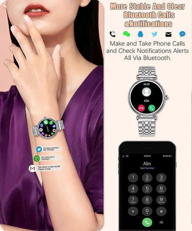 - **Bluetooth Calls & Notifications**: Built-in HD speaker lets you answer calls, view messages, and manage contacts directly from your wrist.