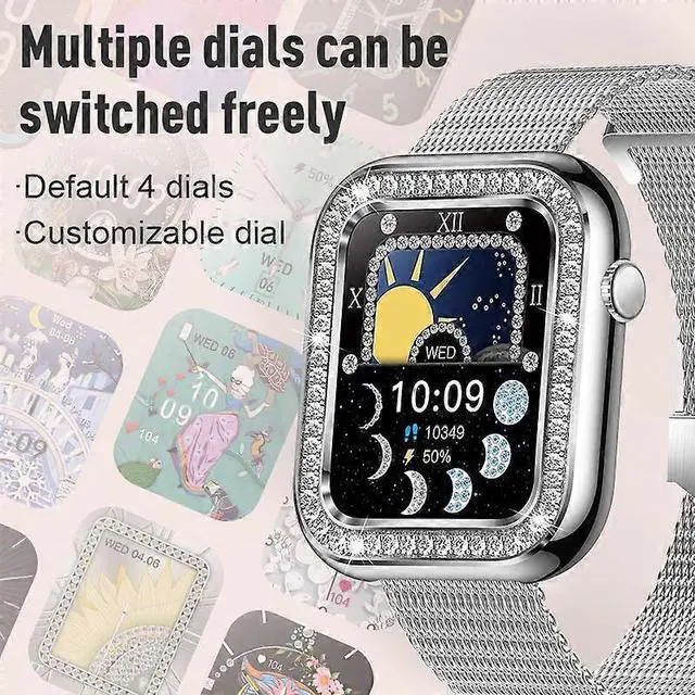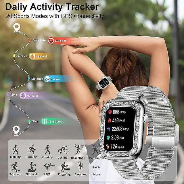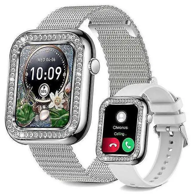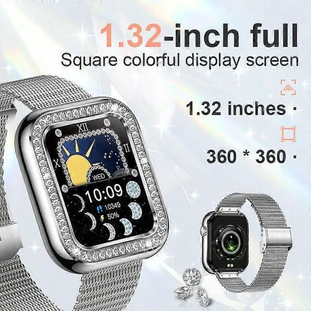 Elevate your daily routine with this stylish 1.57 -inch touchscreen smartwatch for women, featuring a rhinestone-studded bezel and silver steel/silicone strap.