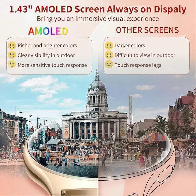 - 1.43 -inch AMOLED HD round touch screen with 466*466 resolution for sharp outdoor viewing