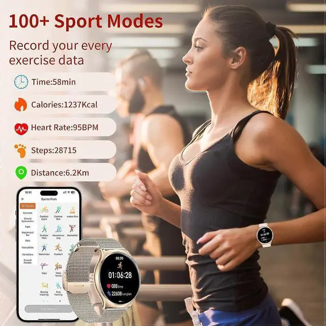 - 100+ sports modes (e. g., running, yoga, football) to track workout time, calories, steps, and distance