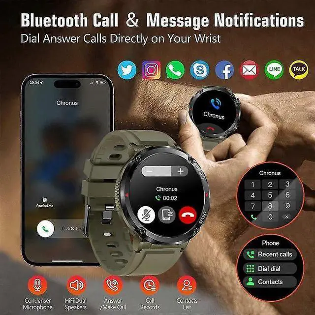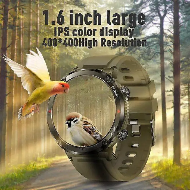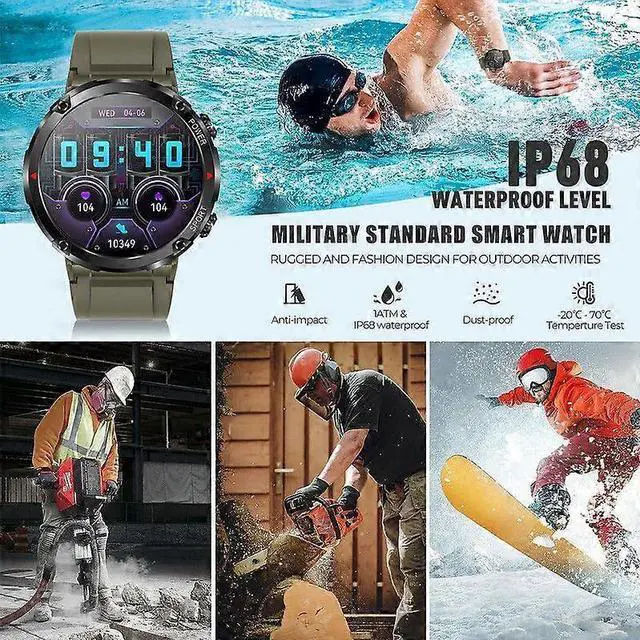 Experience ultimate durability and functionality with our military-grade smartwatch. Featuring a 1.6 -inch HD IPS touch screen with 400x400 resolution for crystal-clear visuals. Built to withstand extreme conditions with IP67 waterproof rating, temperature resistance, and dustproof certification. Track your health 24/7 with heart rate, blood oxygen, sleep monitoring, and 22 sport modes. Enjoy extended battery life with 7-10 days of usage and 60 days standby. Perfect for active lifestyles, outdoor adventures, and daily fitness tracking.