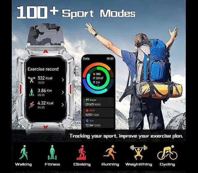 100+ Sports Modes & IP67 Waterproof: Choose from 107 activities including running and cycling; sync with phone GPS and view data on calories, steps, and distance. Water-resistant for splashes and sweat.