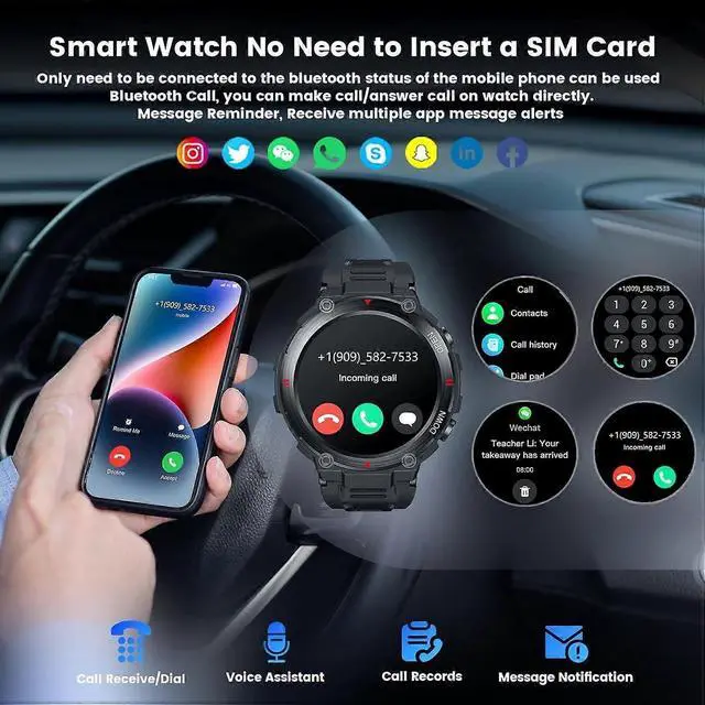- **Bluetooth Calling & Notifications**: Make and answer calls directly, and receive alerts for SMS, WhatsApp, and social apps with built-in microphone and speaker.