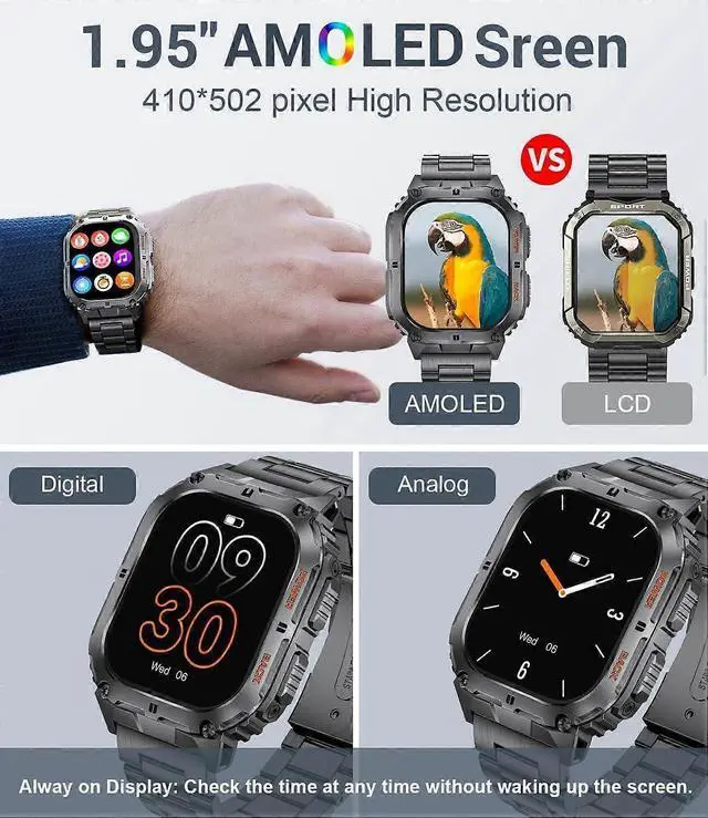 Elevate your fitness and connectivity with this advanced men's smartwatch featuring a vibrant 1.96" AMOLED display for crisp outdoor visibility and energy efficiency.
