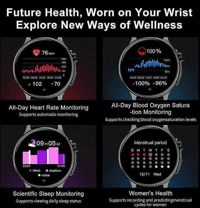 **Advanced Health Monitoring**: Includes 24/7 heart rate, blood oxygen, blood pressure, and sleep tracking, with menstrual cycle reminders for holistic care.