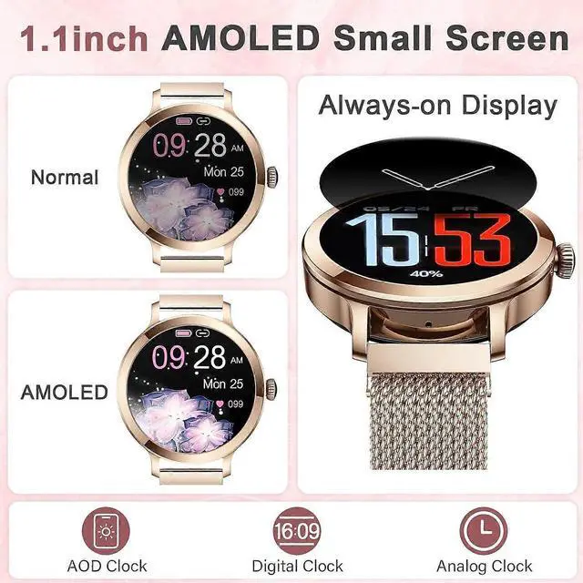 - **Vibrant 1.1" AMOLED Screen & Customizable Straps**: Enjoy a high-definition touch display with adjustable brightness, paired with a Milanese steel strap and pink silicone band for versatile styling.