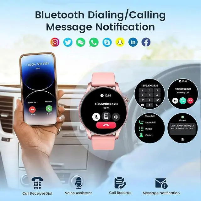 Smart notifications for messages, social media, and app alerts with multi-language support