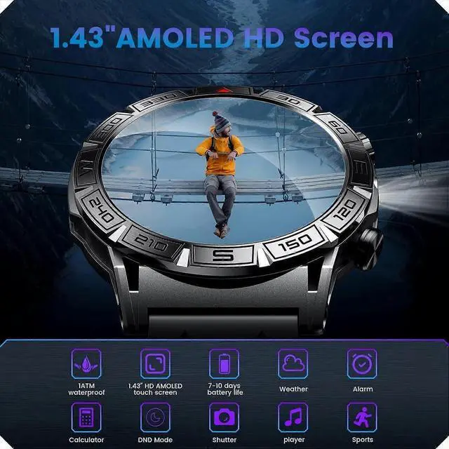 Elevate your fitness and connectivity with this advanced men's smartwatch featuring a 1.43" AMOLED touchscreen for crisp visuals and smooth interaction.