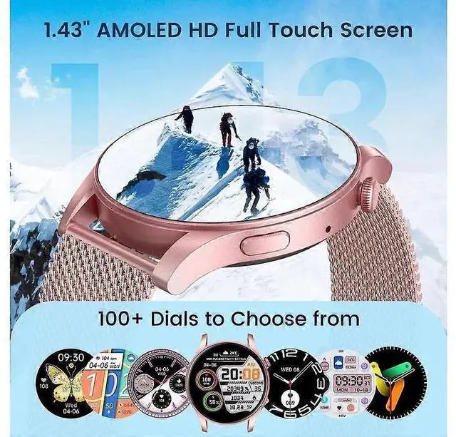 Elevate your fitness and style with this advanced women's smartwatch featuring a 1.43 -inch AMOLED touch screen for smooth visuals and scratch resistance. Customize with rich dials or personal photos, and enjoy versatile wear with included steel and silicone straps.