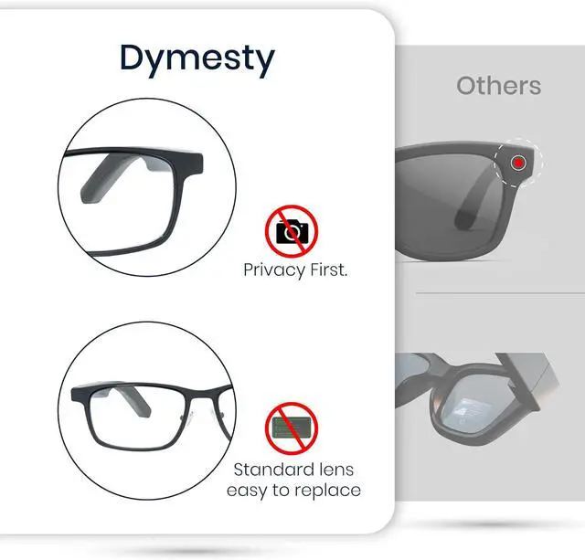 NO CAMERA, PRIVACY FIRST: Dymesty Smart AI glasses are intentionally designed without any cameras, embodying our Privacy-First principle. No privacy concernsworkplace friendly. For any questions, feel free to contact us anytime.
