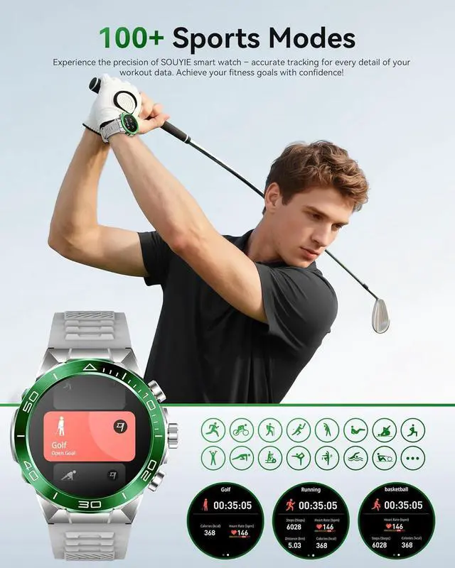 1.43" HD AMOLED, 466x466 Resolution- SOUYIE SM-7 Men's Smart Watch boasts the market's highest resolution at 466x466. Enjoy a clear, vivid visual experience with anti-glare technology for outdoor vi