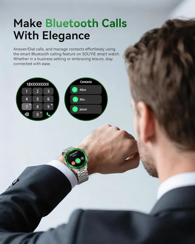 Bluetooth Calling, Voice Assistant, and NotificationsEquipped with an integrated microphone and high-fidelity speaker, SOUYIE Smart watch for men allows you to make/receive/reject calls, view call logs, and add contacts. Android smart watches for men also receives reminder notifications (including SMS, Facebook, WhatsApp, Twitter, Instagram, Facebook Messenger, and more) Ensuring you never miss crucial alerts.