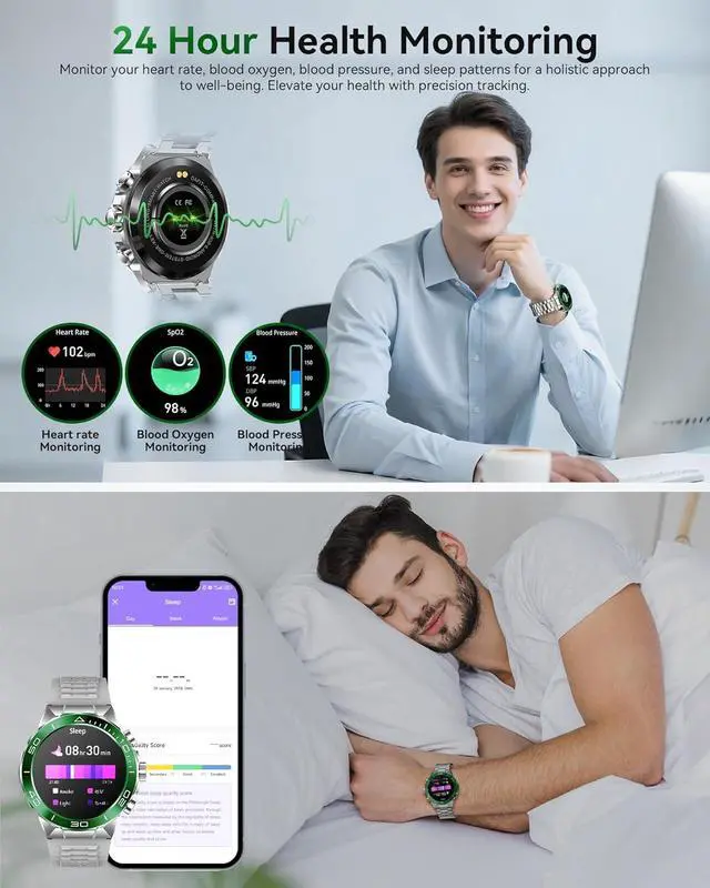 Luxury Men's Smart Watch, 2 Straps, 2 StyleStylish design with a full metal body, luxury, sophistication, and elegance. Smart watch for men android with two styles straps flexibility to match your outfit. The metal strap adds a touch of luxury suitable for business settings, while the silicone strap complements an active lifestyle. The package includes a watchband tool, easy strap change in 1 minute.