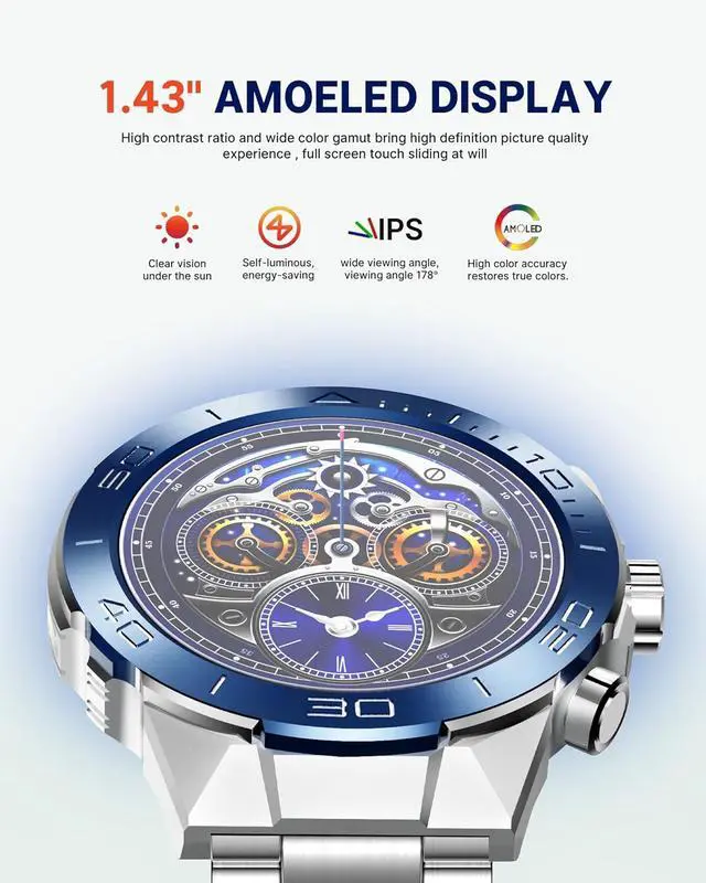 1. 1.43" HD AMOLED, 466x466 Resolution- SOUYIE SM-7 Men's Smart Watch boasts the market's highest resolution at 466x466. Enjoy a clear, vivid visual experience with anti-glare technology for outdoor visibility. The energy-efficient AMOLED display allows the screen to be always on without draining the battery. Choose from 15 pre-loaded watch faces, add 100+ more from the app, or customize with your family or pet pictures.