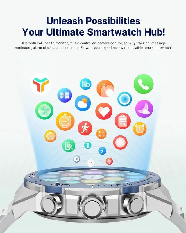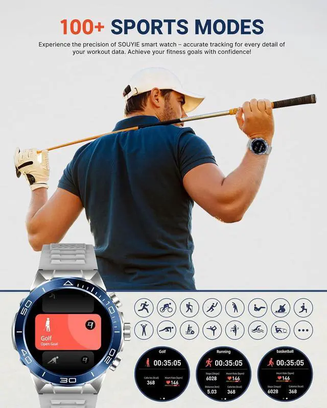 4. Your Personal Smart AssistantActivity tracking (steps, calories, distance), monitor health, various sports modes, monitor sleep, and more. Receive calls, messages/ app notifications. Features include a calculator, remote music/camera control, weather forecast, alarm, stopwatch, find phone, call management, brightness adjustment, power-saving mode, and more. SOUYIE waterproof smartwatch is suitable for handwashing and jogging in the rain (not for swimming, diving, showering/sauna, etc.).