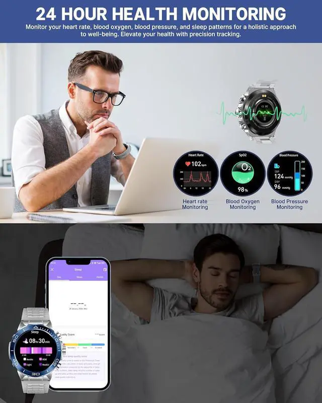 • Luxury Men's Smart Watch, 2 Straps, 2 StyleStylish design with a full metal body, luxury, sophistication, and elegance. Smart watch for men android with two styles straps flexibility to match your outfit. The metal strap adds a touch of luxury suitable for business settings, while the silicone strap complements an active lifestyle. The package includes a watchband tool, easy strap change in 1 minute.