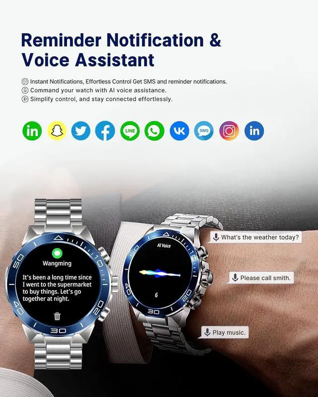 • Bluetooth Calling, Voice Assistant, and NotificationsEquipped with an integrated microphone and high-fidelity speaker, SOUYIE Smart watch for men allows you to make/receive/reject calls, view call logs, and add contacts. Android smart watches for men also receives reminder notifications (including SMS, Facebook, WhatsApp, Twitter, Instagram, Facebook Messenger, and more) Ensuring you never miss crucial alerts.
