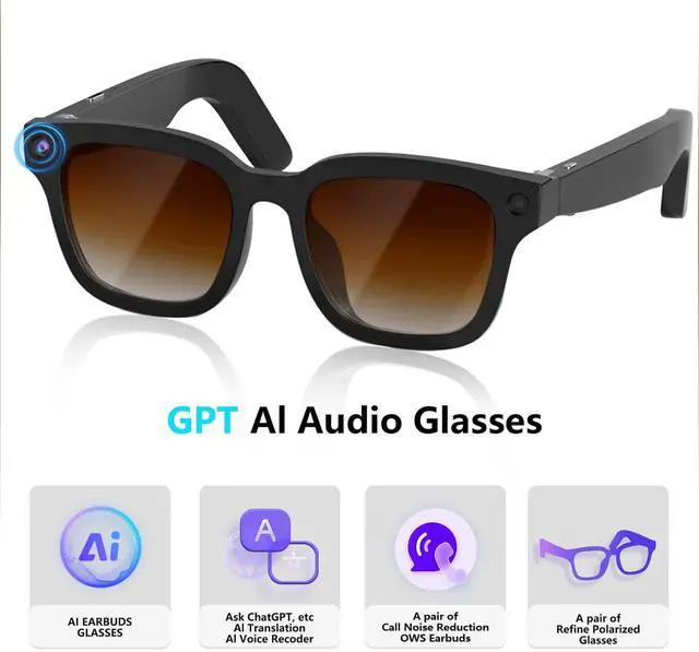AI Smart Glasses with ChatGPT, 8MP Camera Glasses with Camera and Audio, AI Translation Sunglasses with 164 Languages, Bluetooth Sunglasses with Voice /Calling, 8-Hour Music Playback, Gradient Brown