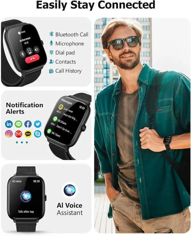 BLUETOOTH CALLING & SMART NOTIFICATIONS Make and take calls directly from your smartwatch with crystal-clear audio. Stay connected with real-time alerts for calls, texts, and apps like Facebook, WhatsApp, and Instagramso you never miss a thing. Plus, the built-in AI voice assistant lets you go hands-free for ultimate convenience