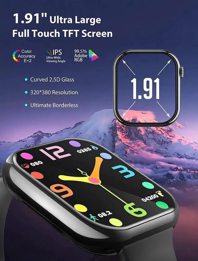 [1.91'' Ultra Large Display] Smart watch with a super-large 1.91" HD colorful screen, adopts borderless tech & curved 2.5D glass, displays more information at a glance. Design with a multi-function rotary encoder, rotate the button to change the wallpaper and operating themes to satisfy diverse aesthetics.
