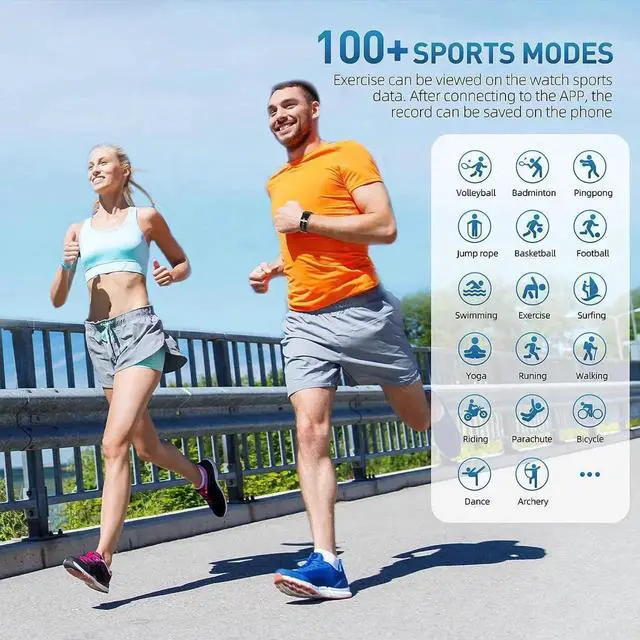 Sports Function: Our sport watch has 100+ exercise modes: Outdoor running, Cycling, Jump rope, Swimming, Badminton, Table tennis, Tennis, Mountain climbing, Walking, Basketball, Football, Baseball, Volleyball, Cricket, Rugby, Hockey, Dancing, Spinning, Yoga, Sit-ups, Indoor running, Gymnastics, Rowing, Jumping jacks and etc.