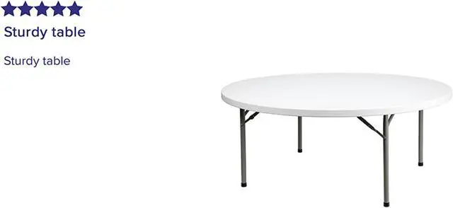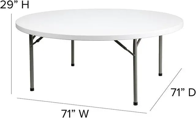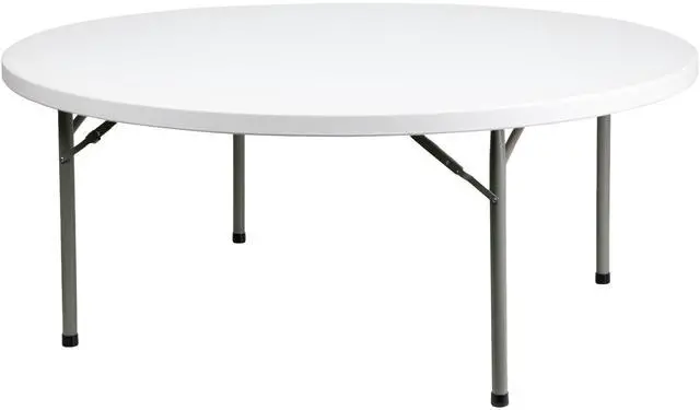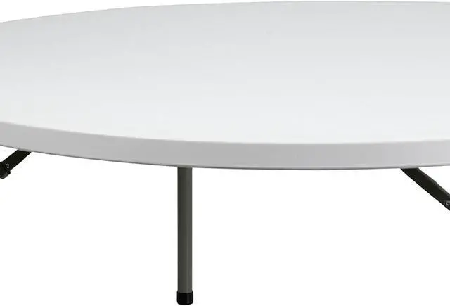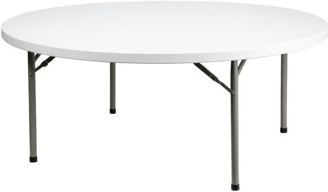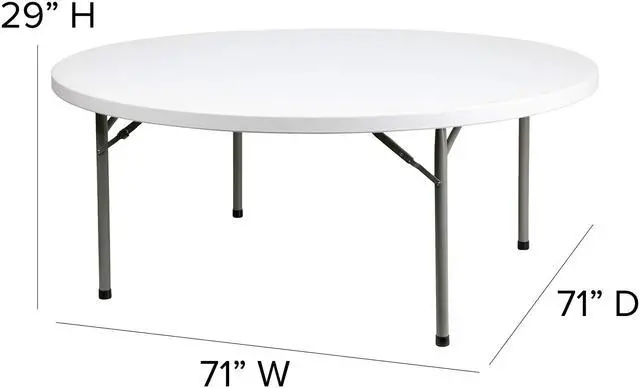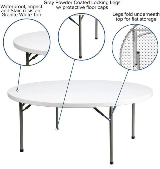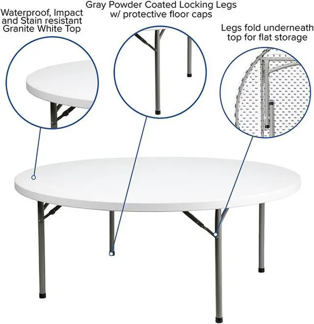 Ensure you have enough surface space for any function and take the stress out of hosting your next gathering. The round dining folding table is a great option for special event planners, catering companies and banquet facilities. This durable, easy to clean table is commercial rated for use in banquet halls, convention centers and at trade shows. Use during game night, dress it up for holiday parties, and coordinate crafts night. The thick, granite white tabletop is 72" in diameter, 2.125" thick, and will comfortably seat up to 10 adults.