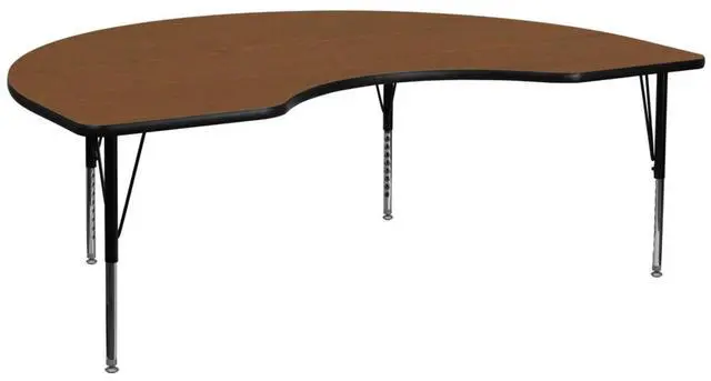 This Kidney Activity Table is a must have for daycare, preschool and early childhood development centers. Enhance collaborative learning by grouping tables together. It will accommodate children up to age 7.It features a 48''W x 72''L high pressure scratch, stain and warp resistant laminate top with a black edge band and 16 gauge tubular steel legs for increased stability. The top incorporates a protective underside backing sheet to prevent moisture absorption and warping. An attractive black powder coated finish protects the upper legs from scratches and height adjustable chrome lower legs give you the flexibility to raise or lower the table a full 9 inches in 1 inch increments. Self-leveling nylon floor glides keep the table from wobbling and protect your floor by sliding smoothly when you need to move it.Perfect for craft time, snack time and party time, this easy to clean table is just the right size for small children.