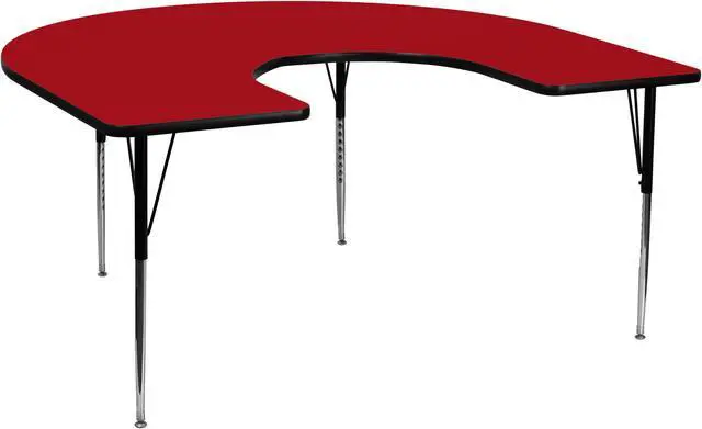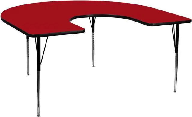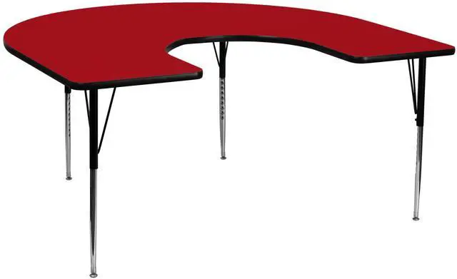 The Horseshoe Activity Table is a versatile option for school classrooms, corporate training centers and your home. Enhance collaborative learning by grouping tables together. It will accommodate children of all ages, from 1st grade to adult.It features a 60''W x 66''L thermal fused scratch, stain and warp resistant laminate top with a black edge band and 16 gauge tubular steel legs for increased stability. The top incorporates a protective underside backing sheet to prevent moisture absorption and warping. An attractive black powder coated finish protects the upper legs from scratches and height adjustable chrome lower legs give you the flexibility to raise or lower the table a full 9 inches in 1 inch increments. Self-leveling nylon floor glides keep the table from wobbling and protect your floor by sliding smoothly when you need to move it.This activity table provides a durable work surface for anything from computer labs to project meetings to laying out fabric in your sewing room.