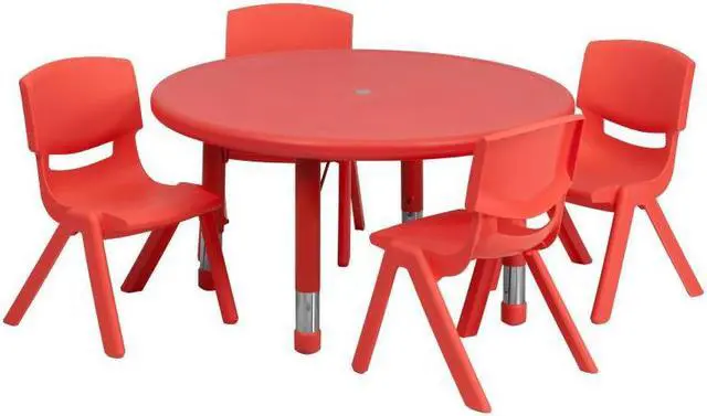 Setup a collaborative table set for kids to interact by using round activity tables. Designed for safety around rambunctious toddlers, the table has rounded edges and the plastic stack chairs are constructed of metal-free materials. This activity table set serves as a play table or kids dining table in the classroom or home. Built for comfort, the shell chairs are a one-piece contoured designed to promote proper posture. Not only are these chairs designed properly, but they are lightweight so kids can feel independent by moving the chairs themselves. With this play activity table set setup in the playroom you're always prepared for play dates and birthday parties.