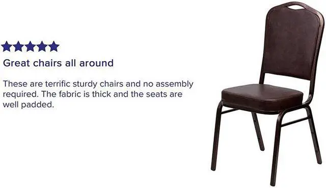 Make an impressive presentation in your banquet hall when clients come to visit your facility with these ballroom chairs. Built for the commercial industry these popular crown back banquet chairs have been tested to hold up to 500 pounds. With a high seating capacity these stack chairs are perfect for the event rental business. This standout hospitality chair can be used as is and still command attention or be dressed up for formal events by placing a chair cover over it. The chair is cushioned with 2.5" thick CAL 117 fire retardant foam and is covered in durable upholstery for high usage.