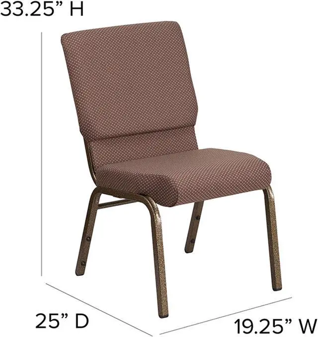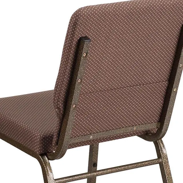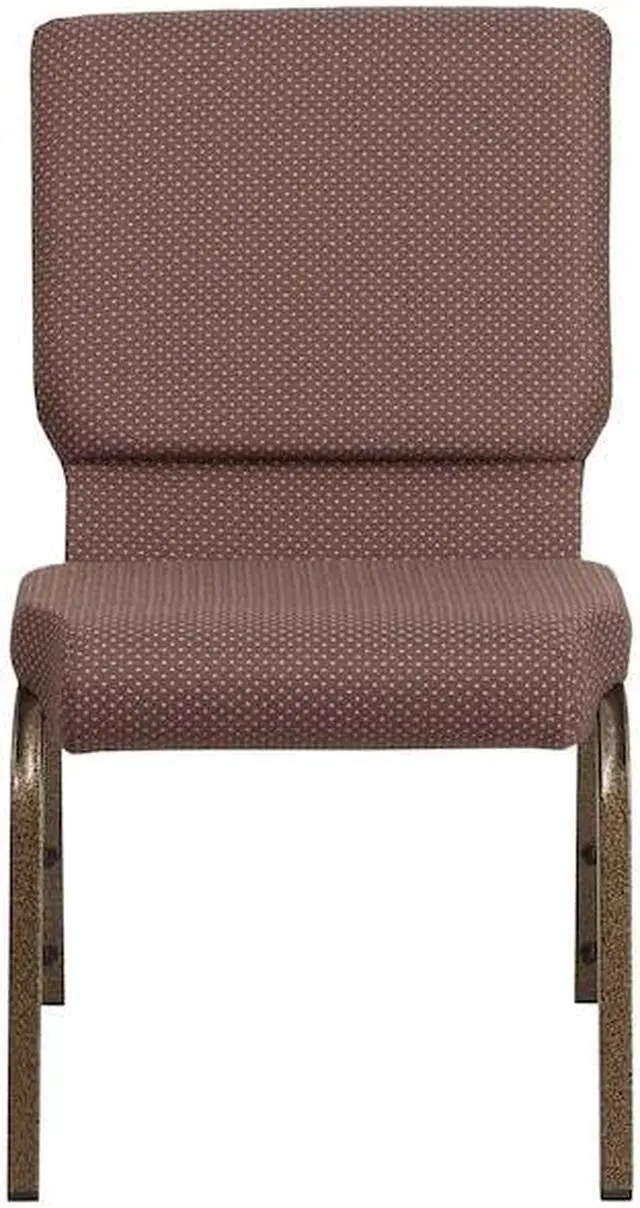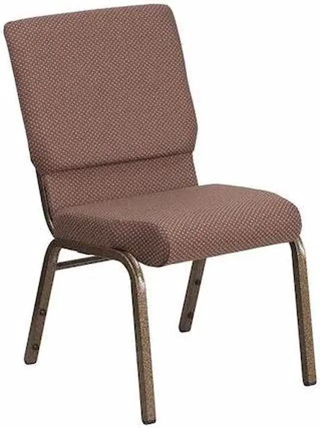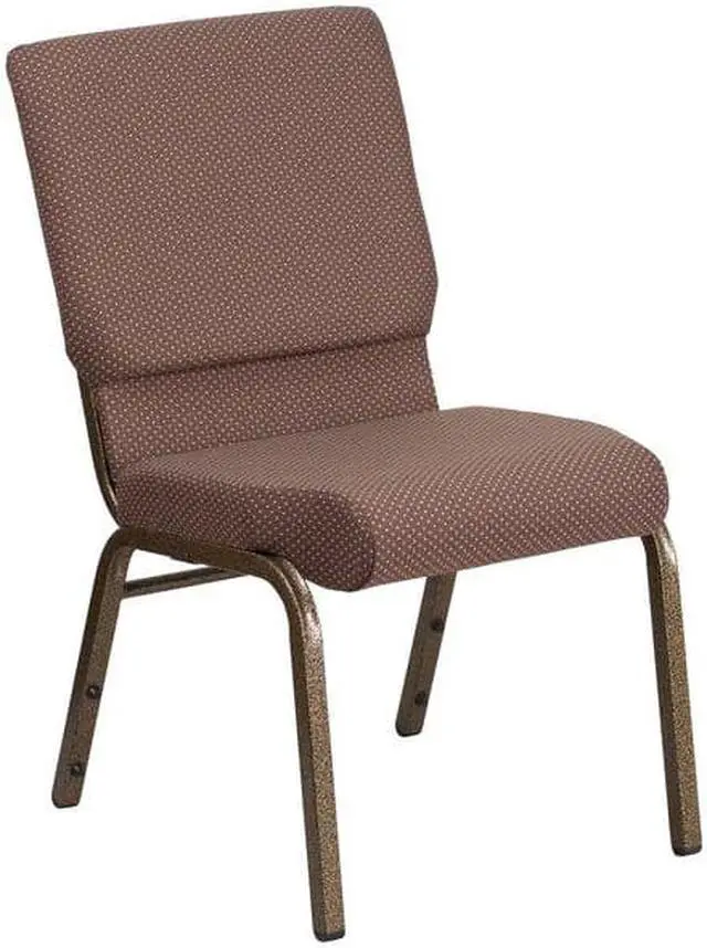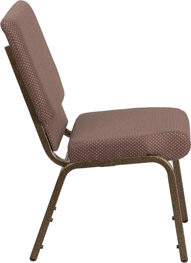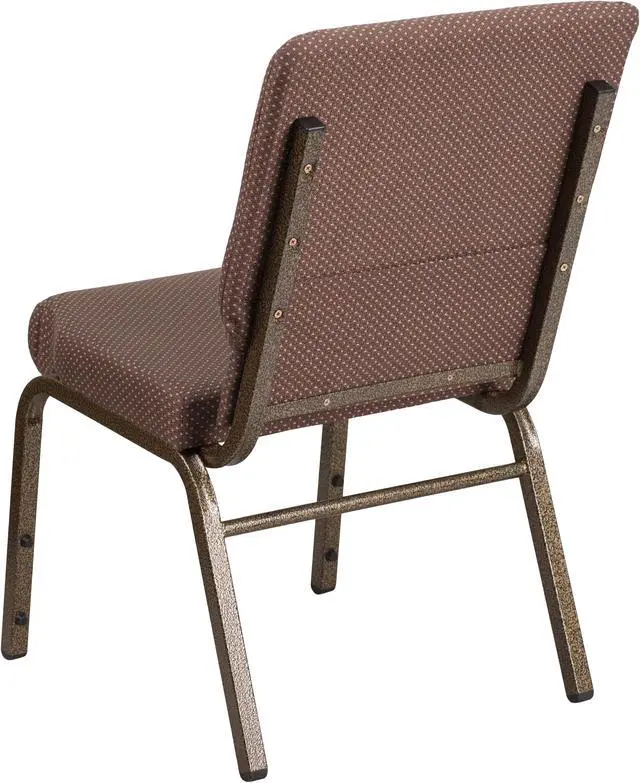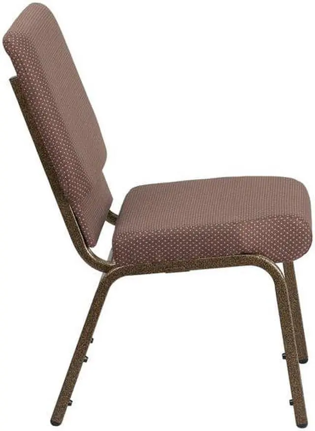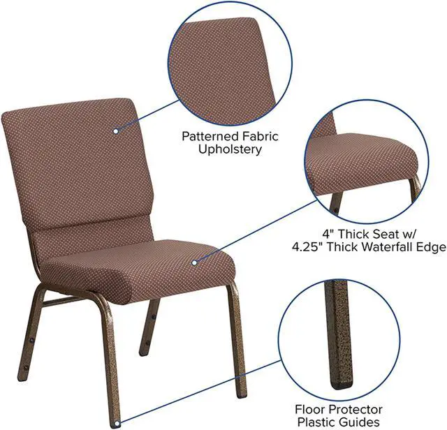 A convenient book pouch on the back of the chair keeps seminar materials, bibles or hymn books readily available. Built-in ganging brackets connect your chairs and maintain nice, straight rows. Its sturdy 16 gauge steel, copper vein frame, with gracefully angled legs, has been tested to hold up to 800 pounds and plastic rocker glides protect your floor by sliding smoothly when you need to move the chair. This commercial side chair is stackable for easy storage making it an excellent choice for event venues, hotel lobbies, banquet halls, conference facilities and worship centers.