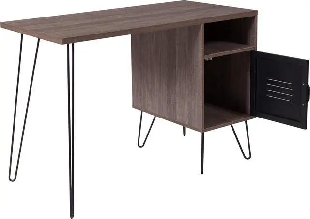 Woodridge Collection Rustic Wood Grain Finish Computer Desk with Metal Cabinet Door and Black Metal Legs