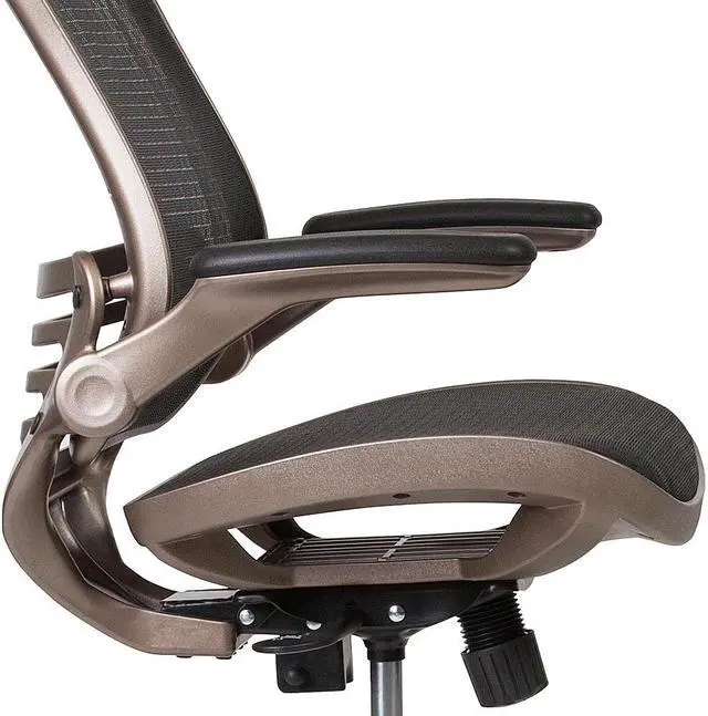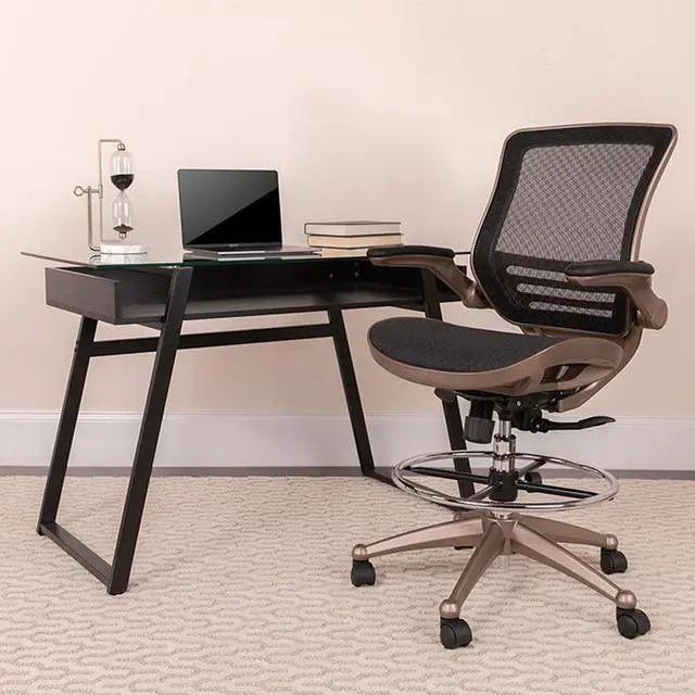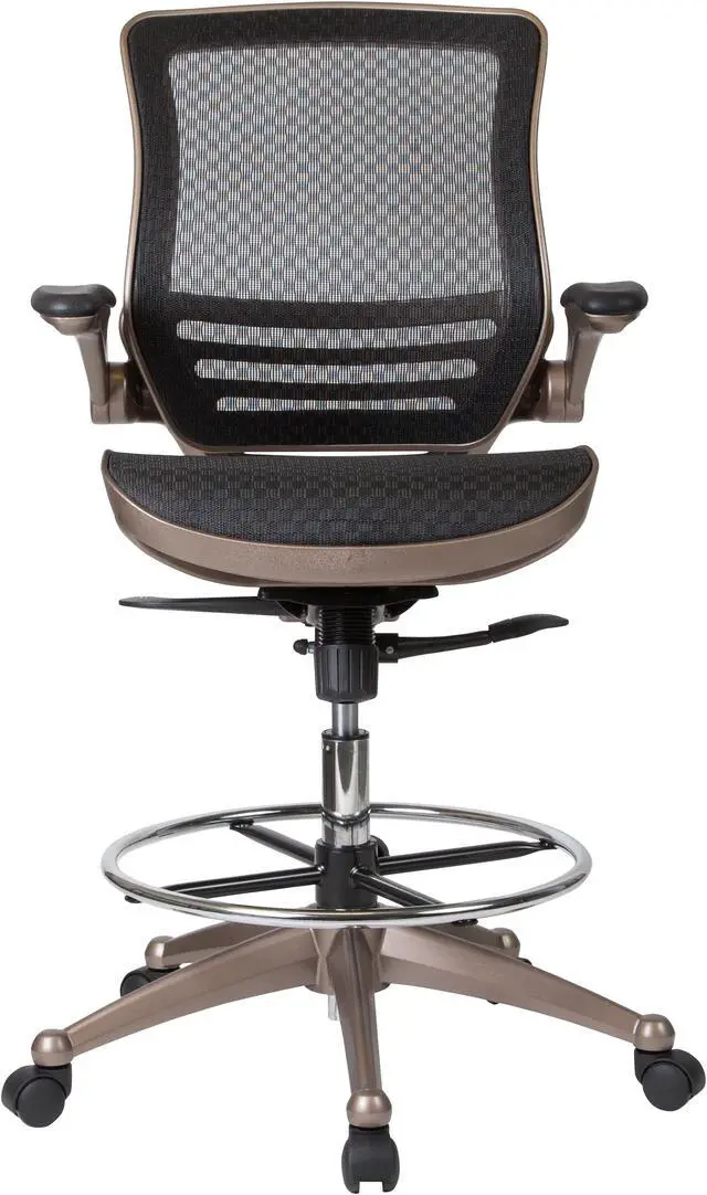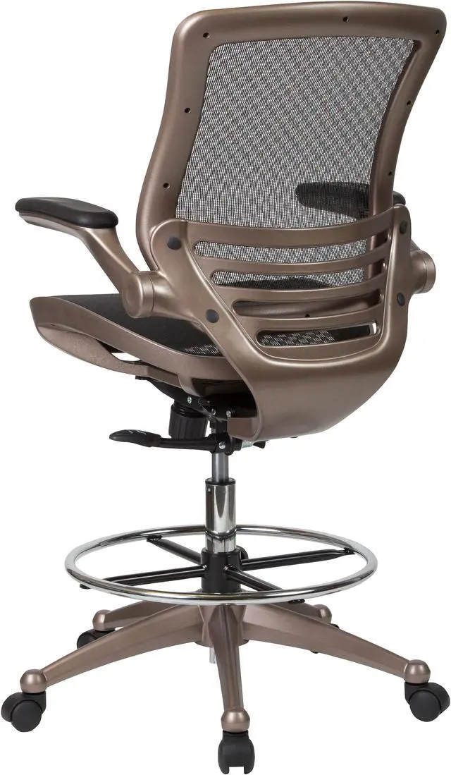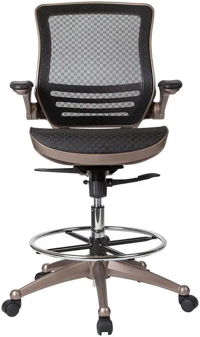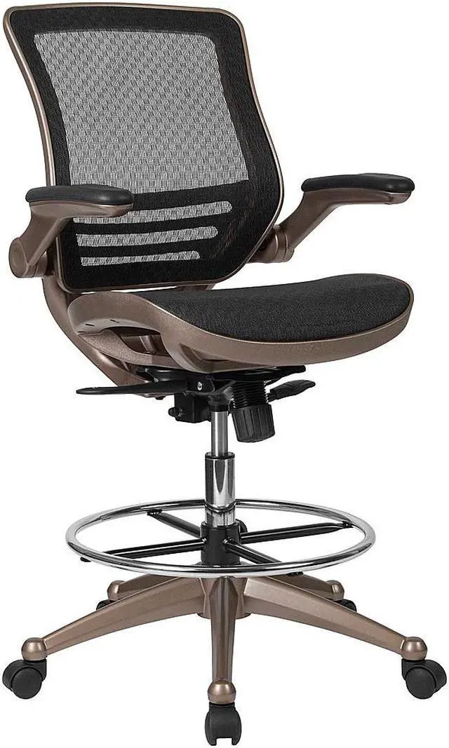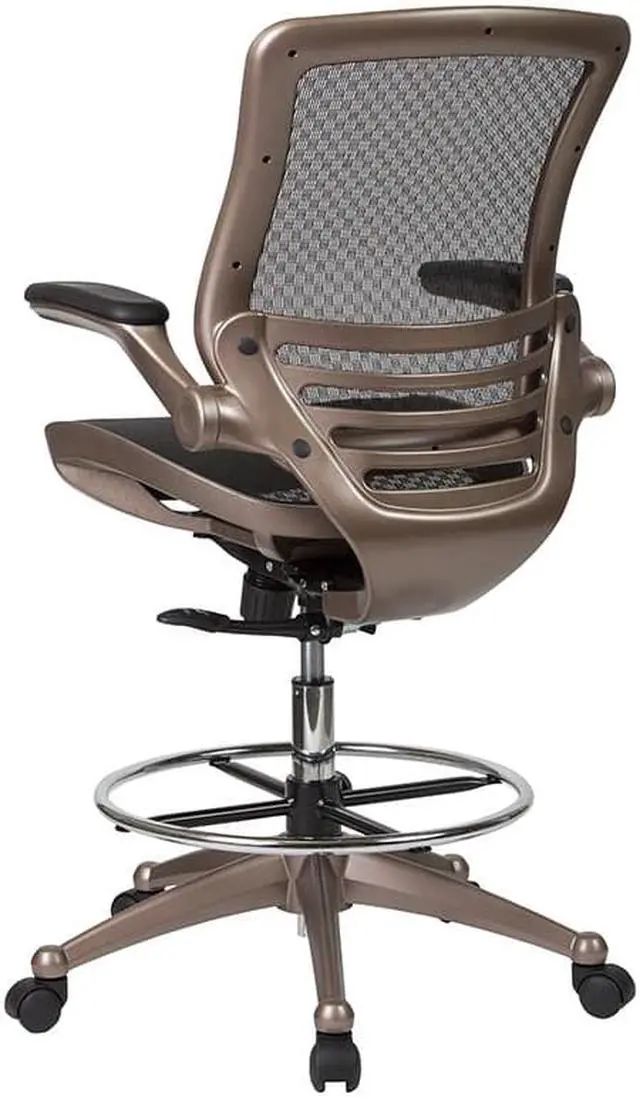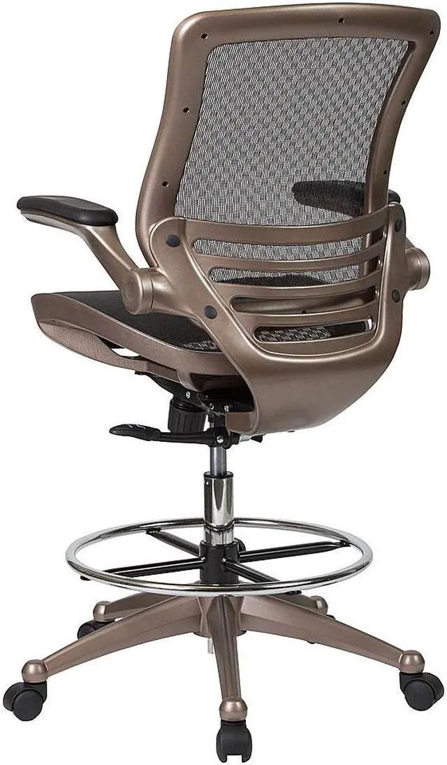 Padded armrests flip up and out of the way as needed, allowing you to quickly switch between tasks with greater flexibility. Breathable mesh material helps keep you cool during extended work sessions and pairs perfectly with the attractive Melrose gold frame for a sleek, contemporary aesthetic. Additional features of our drafting table chair include: - - Synchro-tilt control that lets the chair's seat and back recline into your ideal sitting position. - - Dual-wheel, easy-rolling casters that glide across any surface for effortless mobility. - - Contoured backrest with lumbar support that reduces back and neck strain. - Enhance your work experience with our mesh drafting chair offering a practical and attractive seating solution. Whether used at home or the office, this mid-back mesh chair swivels 360 degrees to maximize your workspace without causing strain.