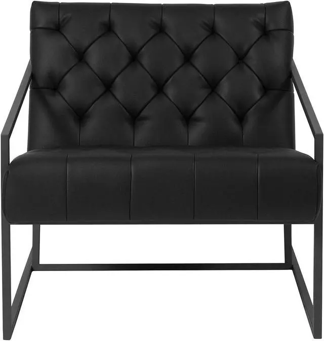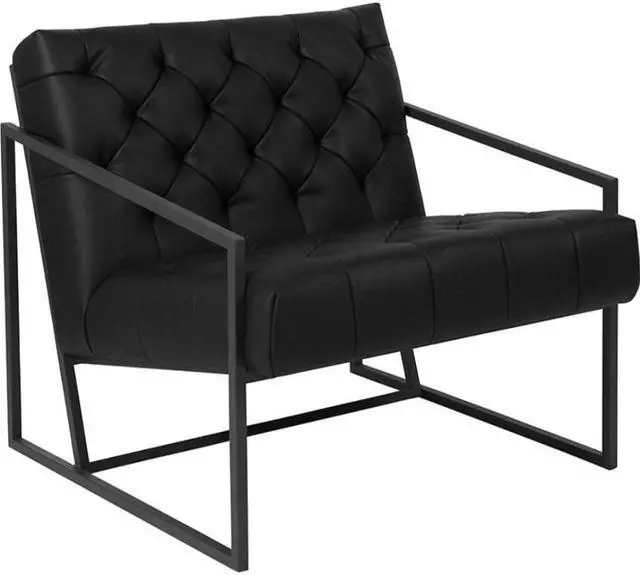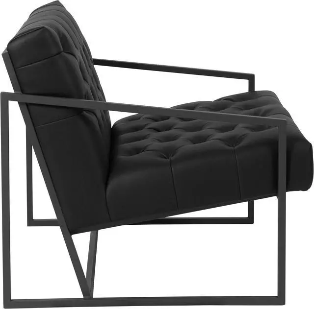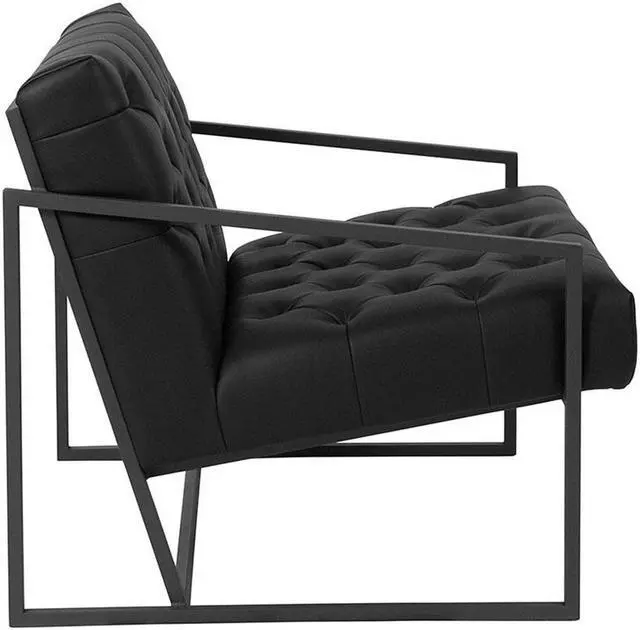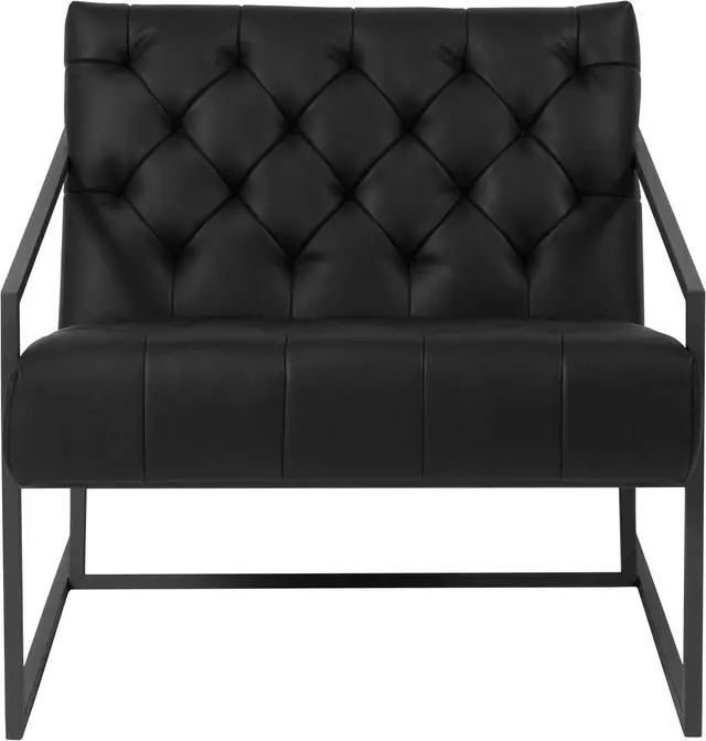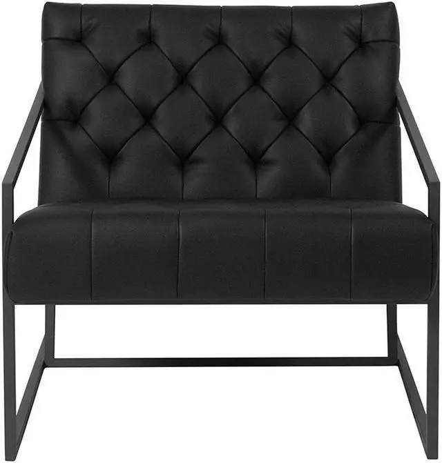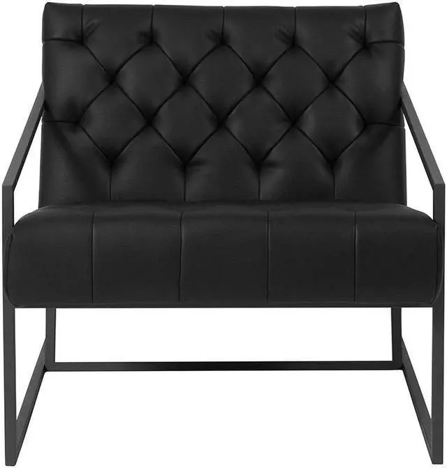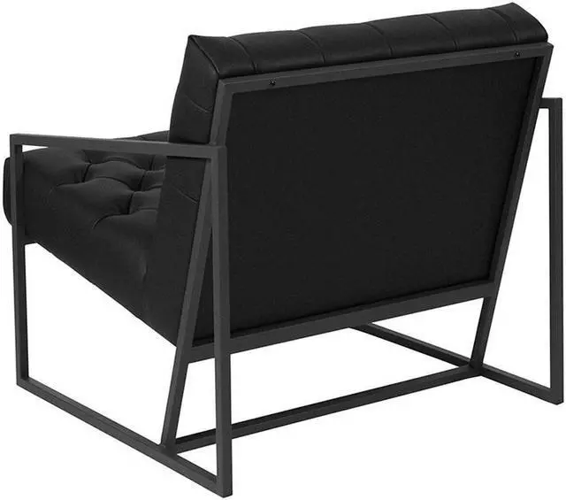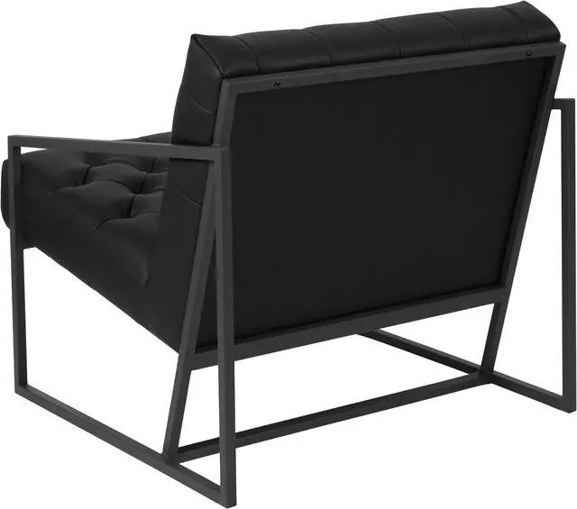 Transform your space and give visitors to your home or business something visually stimulating with this unique lounge chair. This versatile chair boasts an integrated frame that not only acts as an accent piece but also features slanted arms. The tufted back and seat done in black LeatherSoft upholstery give this piece a retro look that your clients and guests will notice. LeatherSoft is leather and polyurethane for added softness and durability. Set a trend with this cozy lounge chair that will be just as at stunning in your home as an accent chair as it is in your reception area.
