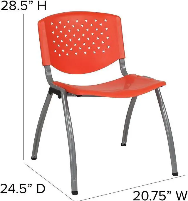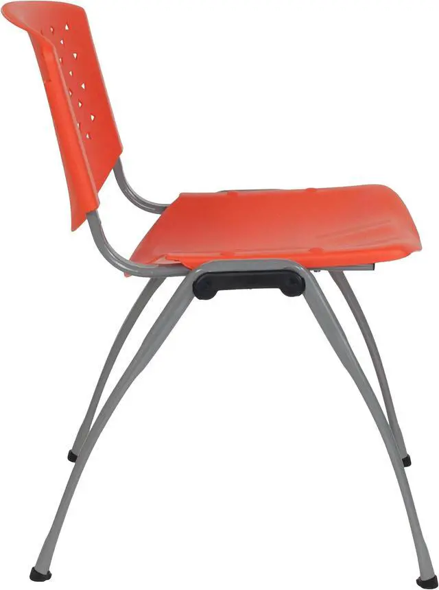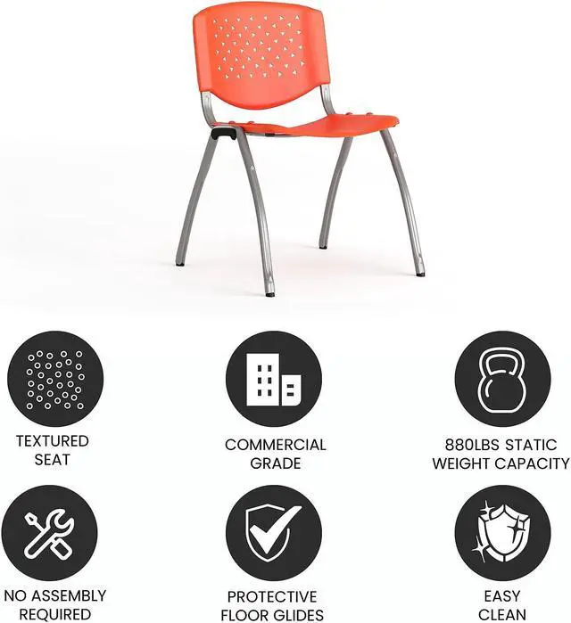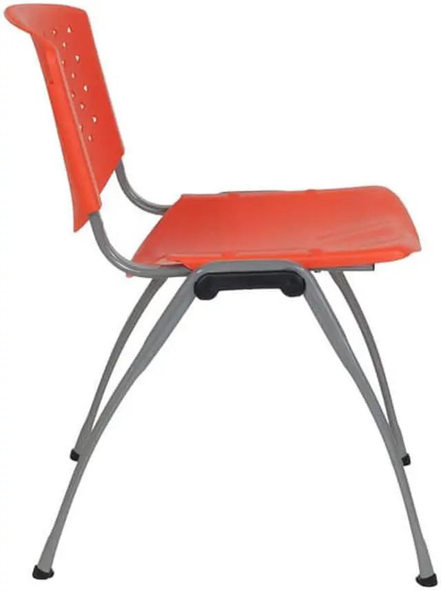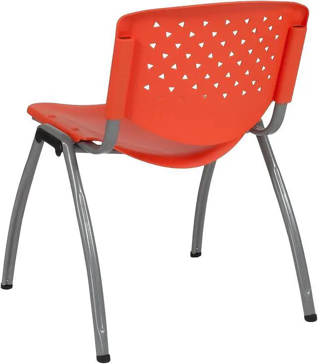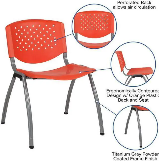 The stacking chair features a perforated back, textured seat to sit safely and a titanium gray finished powder coated metal frame that holds up to 880 pounds. Whether you need to furnish a small or large business there's no job that this heavy-duty plastic guest chair won't be able to handle. These orange plastic stack chairs stack up to 25 chairs high and can be transported across the facility on our steel stack chair and church chair dolly.