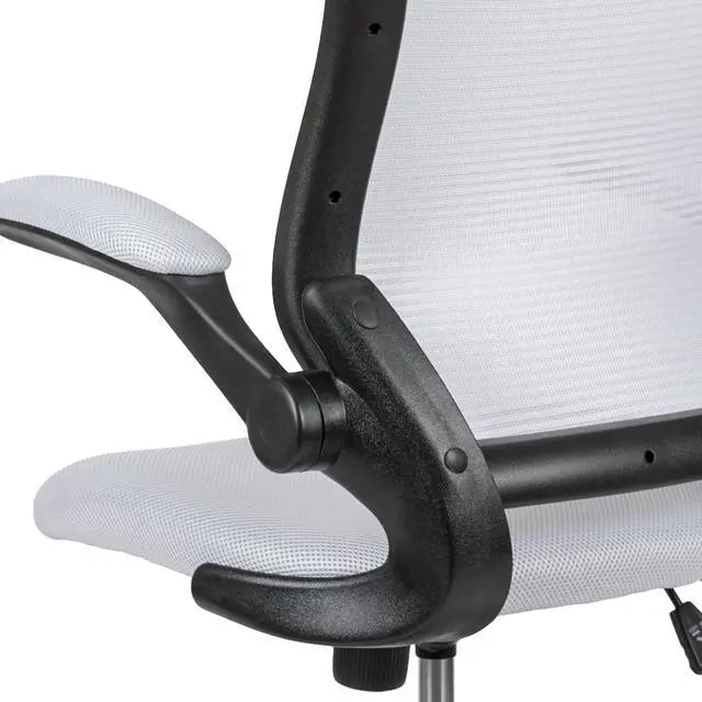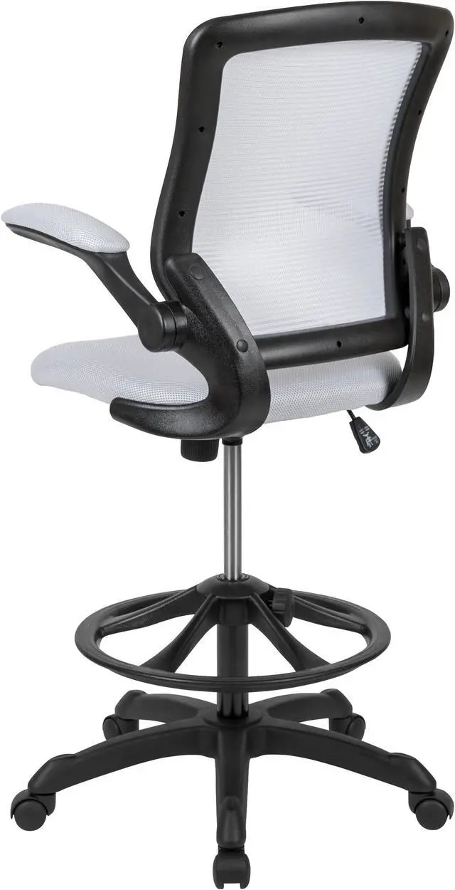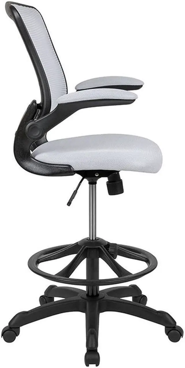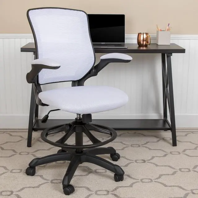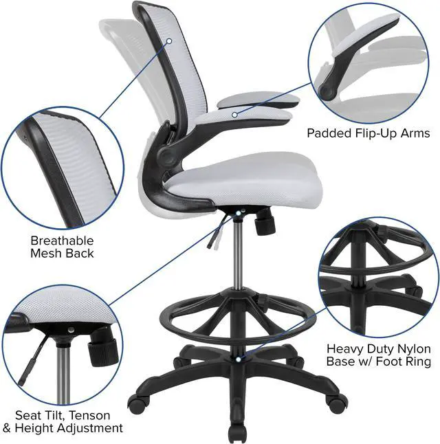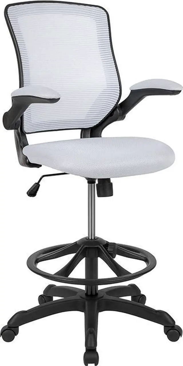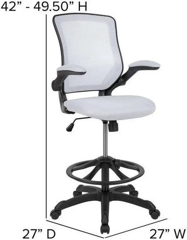 Be proactive at work when you roll this high office chair into the office to accompany your high desk. The high desk chair pairs well with sit-to-stand desks, standing desks, bar height tables and drafting tables. This ergonomic mesh back drafting chair allow employees working with the public to be at a comfortable eye-level when their work surface is above standard desk height. Enjoy the comforts of an ergonomic chair in a taller frame to meet the needs of students and professionals working at above average desk heights. The curved back cradles you while offering built-in lumbar support. Designed with your comfort in mind, this drafting stool features a pressure relieving waterfall edge seat and flip-up arms to relieve pressure off your shoulders and neck. Pull the tilt lock out to recline and rock or push in to lock in an upright position. The frame is outfitted with a stylish height adjustable foot ring. Draft chairs are essential for any profession where work surfaces are above standard height, such as lab technicians, receptionists, architects, graphic artists, or any other creative assignment. With the ventilated mesh material, you'll be kept at a cool temperature throughout the day on this draft chair to complete your tasks.Product Dimension-27"W x 27"D x 42" - 49.5"H