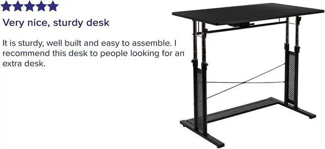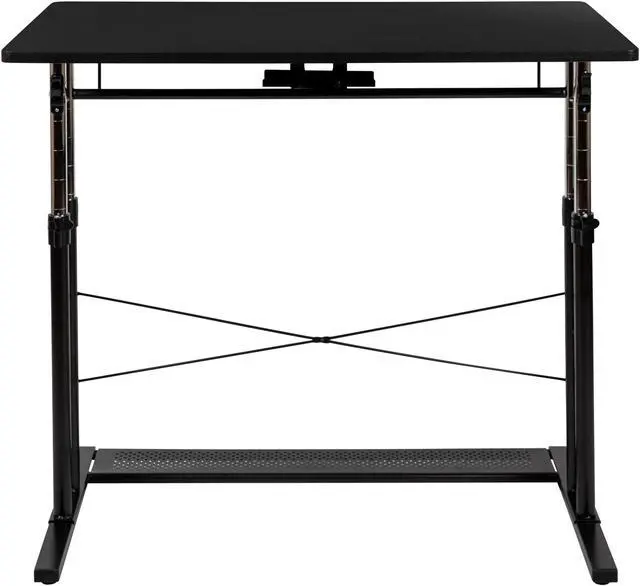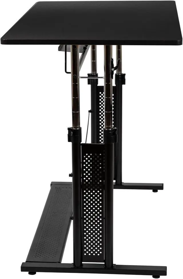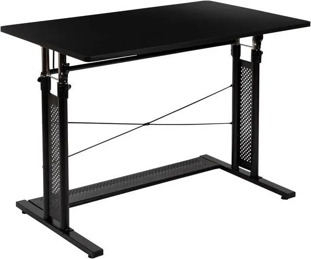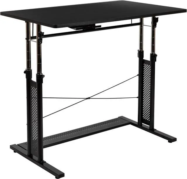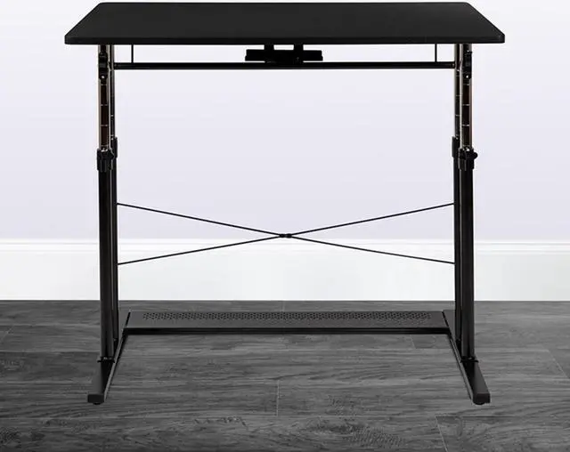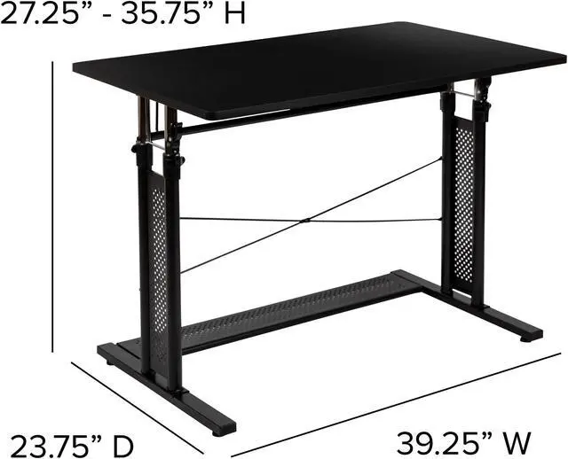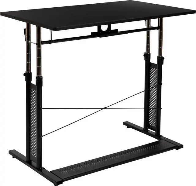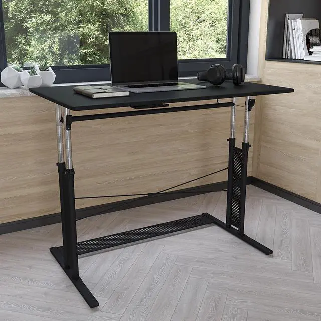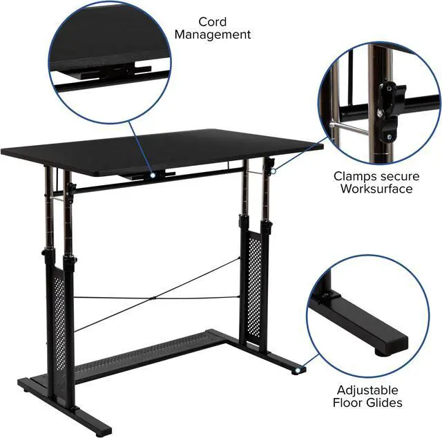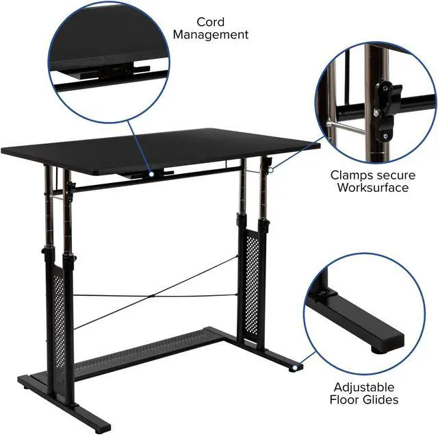 Product Features: Height adjustable computer desk Perfect for working on your laptop Ergonomic desk allows you to set at variable heights Cord management tray underneath top Desk table adjusts by unlatching clamps and pushing lever Secure table surface by closing clamps Stabilizing black pedestal base with adjustable floor glides