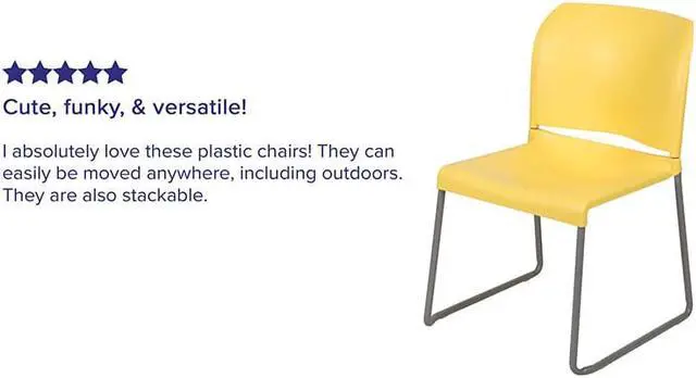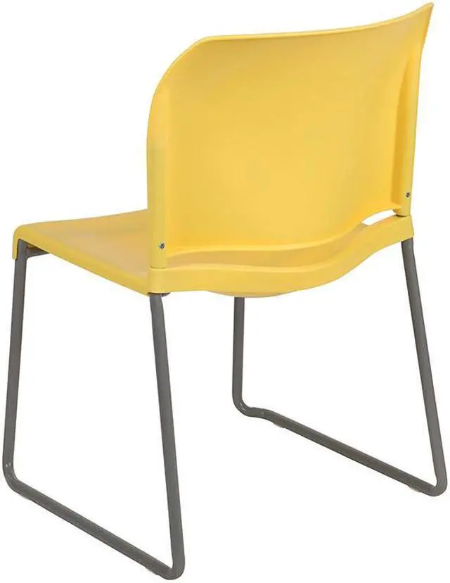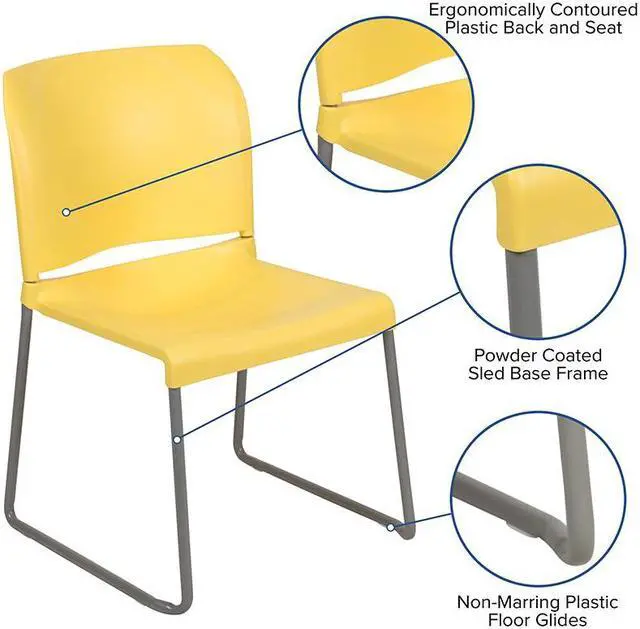 Provide comfortable seating in your lobby, cafeteria, breakroom, auditorium or office with this appealing sled base stack chair. Plastic stack chairs are popular chairs for temporary or permanent seating solutions and are ready-to-use with a fully assembled design. The gray powder coated sled base chair is stylish enough to be used as your modern dining chair and are easy to clean. Create an engaging atmosphere by using different colors in your training room or open workspace. Working in open industrial style offices can be distressing, adding colorful stack chairs around collaborative tables can make the space fun and inviting. These stackable guest chairs are designed to withstand constant use to keep up with the daily demands of your business. For transporting efficiency acquire our steel stack chair dolly.