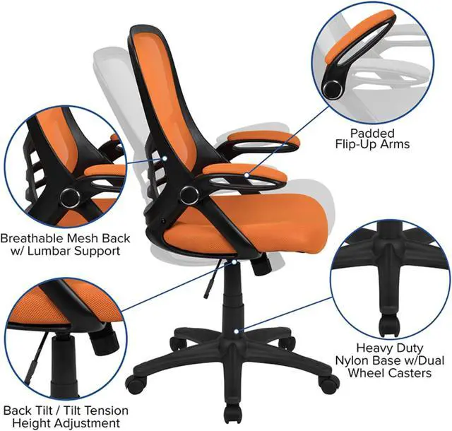 Fall into comfort on this ultra-padded swivel office chair that'll add personality to your home office or professional office space. Put that old chair to rest, having the support of an ergonomic office chair will help improve your attitude when you no longer must sit in discomfort. This modern office chair is equipped with a lever to control the seat height and activates the seat recline. Mesh office chairs are popular due to their ventilated mesh material that allow air to circulate to your back, keeping you cool and calm. Paired with a contoured padded seat with pressure relieving waterfall edge and a high back this executive office chair will integrate into any space. If you like working with your chair raised high a flip-up arm chair is perfect allowing you to flip the arms upward like an armless chair while pulling yourself close to your desk. You'll have no problem taking charge of your workday perched on this high back ergonomic office chair with flip-up arms. You'll wish you had purchased this chair sooner, whether as a personal purchase or to accommodate your entire staff.