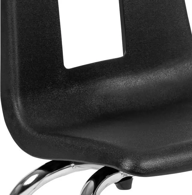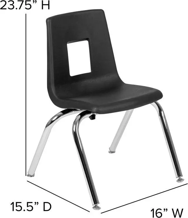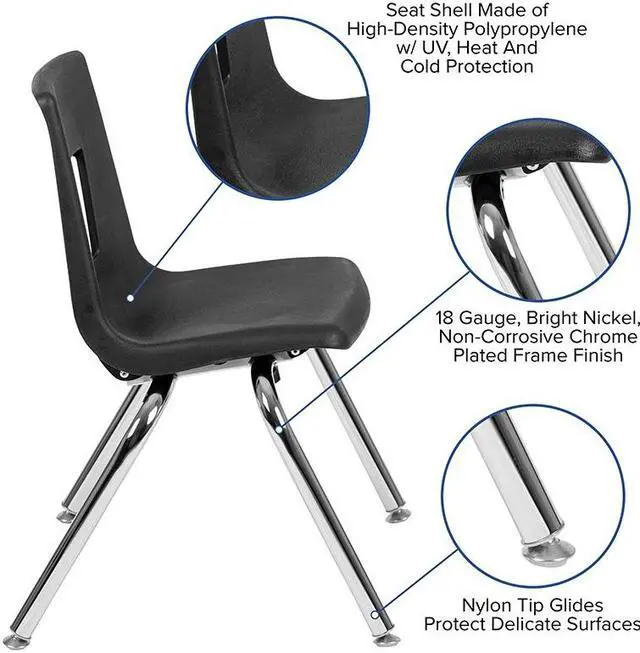 Give kids comfortable seating while being taught in the classroom, daycare or homeschool. The neutral colored school chair will keep children focused on the curriculum. The classroom oriented student stack school chair features a heavy-duty black seat shell made of superior high-density polypropylene, ergonomically shaped for maximum student seating comfort and 18-gauge bright nickel, chrome plated frame. The seat shell is designed to promote student seating comfort and correct seating posture for enhanced learning. Non-exposed rivets hold the school chair shell to the strong, non-corrosive steel frame while nylon tip glides on each leg help protect delicate floor surfaces. This ergonomic stack chair provides a stylish and durable classroom seating solution. The chair stacks up to 12 chairs high to provide ease of cleaning and maximum storage within the classroom. This well constructed, stackable school chair provides an unparalleled level of durability and value to exceed your classroom seating needs.