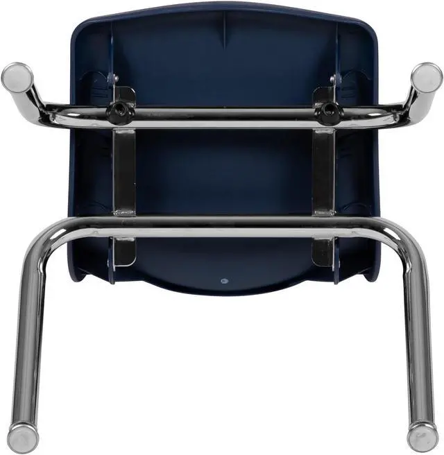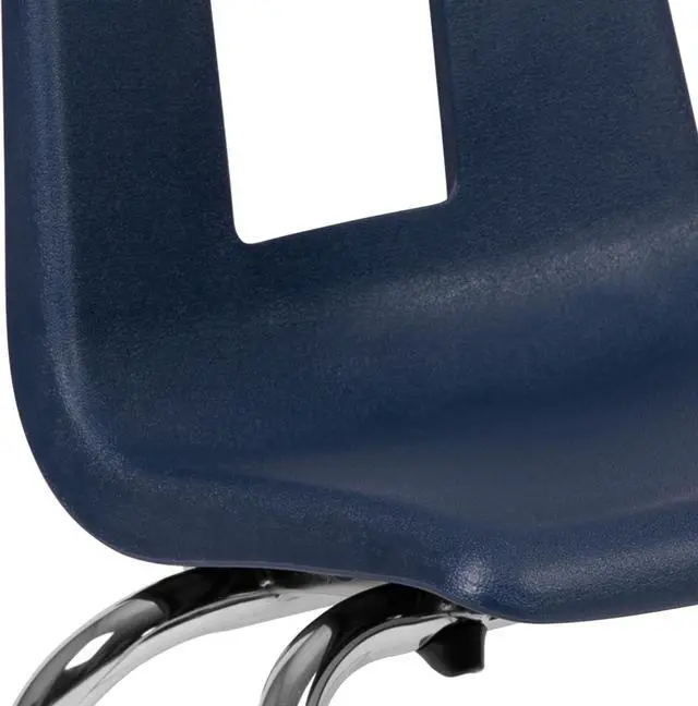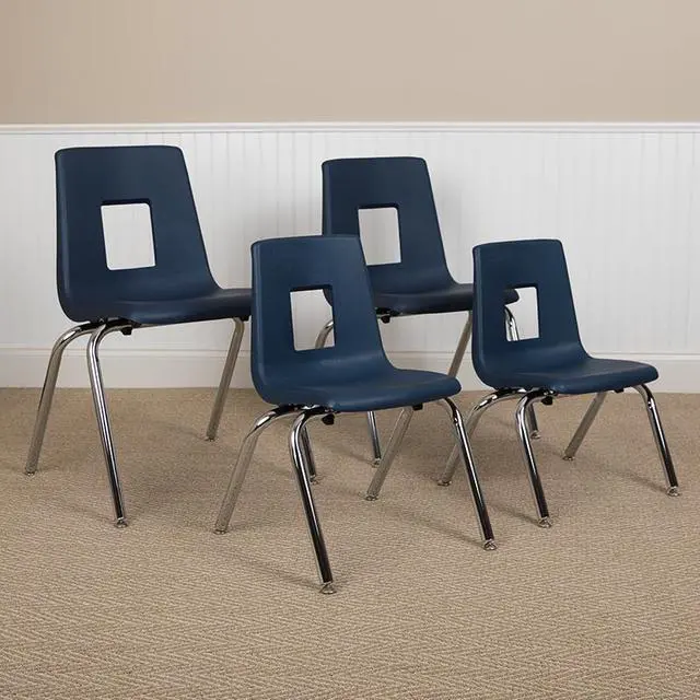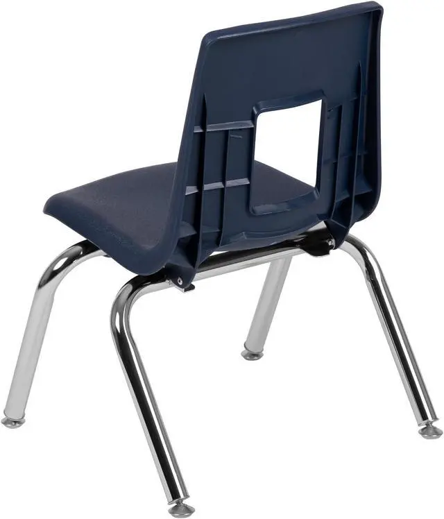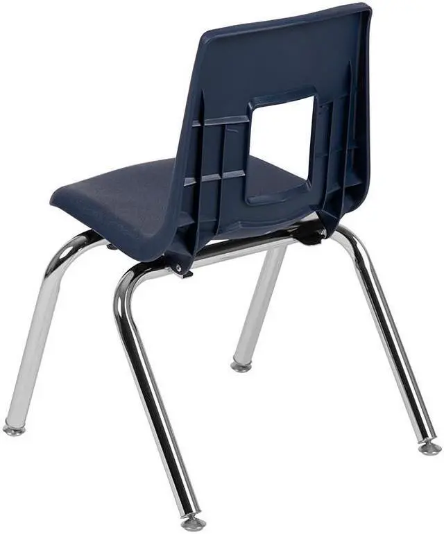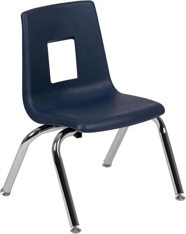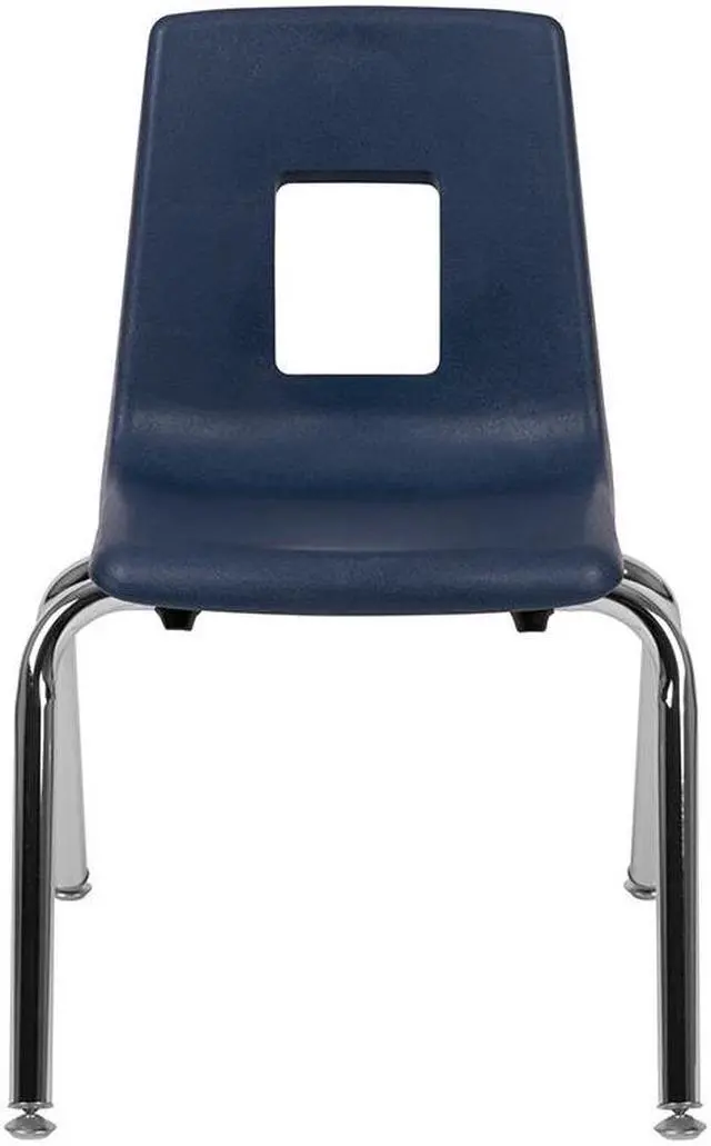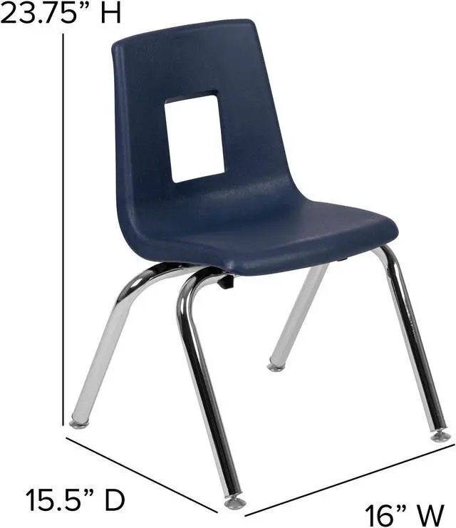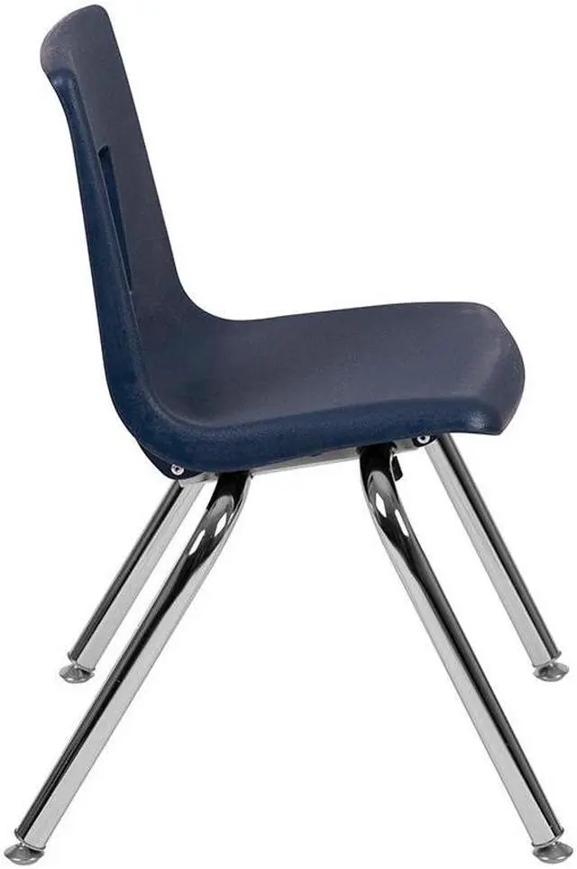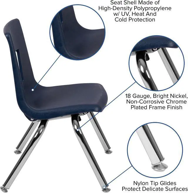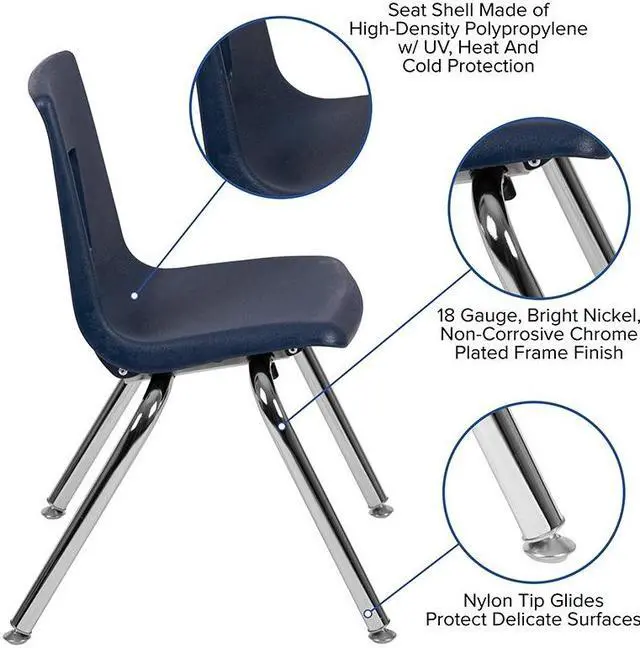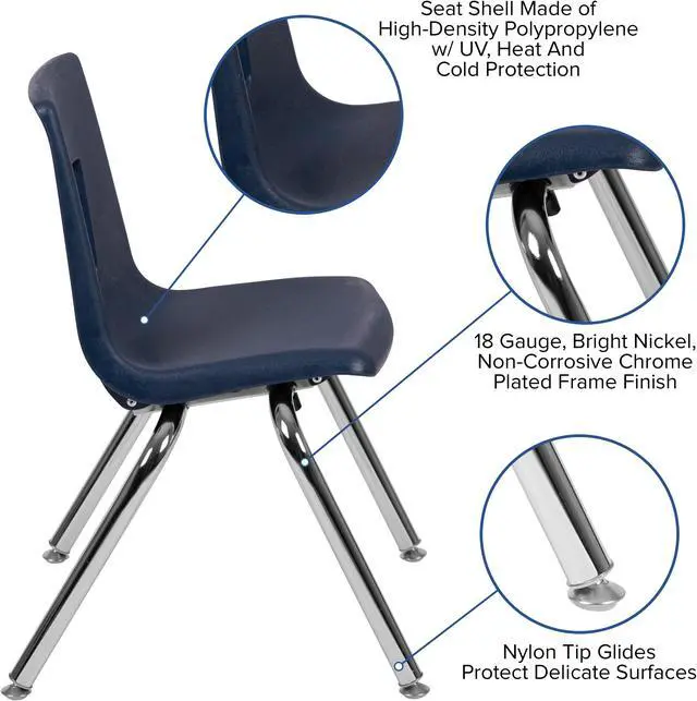 Give kids comfortable seating while being taught in the classroom, daycare or homeschool. The neutral colored school chair will keep children focused on the curriculum. The classroom oriented student stack school chair features a heavy-duty navy seat shell made of superior high-density polypropylene, ergonomically shaped for maximum student seating comfort and 18-gauge bright nickel, chrome plated frame. The seat shell is designed to promote student seating comfort and correct seating posture for enhanced learning. Non-exposed rivets hold the school chair shell to the strong, non-corrosive steel frame while nylon tip glides on each leg help protect delicate floor surfaces. This ergonomic stack chair provides a stylish and durable classroom seating solution. The chair stacks up to 12 chairs high to provide ease of cleaning and maximum storage within the classroom. This well constructed, stackable school chair provides an unparalleled level of durability and value to exceed your classroom seating needs.