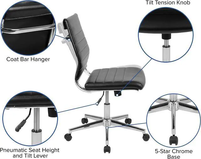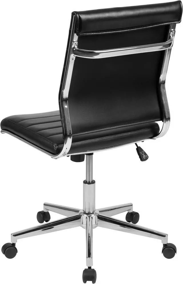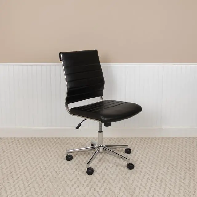 Revive your drab looking office with this ultra-modern executive office chair to turn your office into something extraordinary. Sporting an armless silhouette, you'll have more space between guests when used in board rooms and conference rooms. An integrated back bar provides a convenient position to hang garments such as coats and jackets. Fall into comfort with the ribbed back desk chair backed by curved lumbar support. With no arms to contend with you'll have no issues pulling up under any desk. Adjust the chair to your desired height by utilizing the lever underneath the seat that also locks the chair in an upright position.