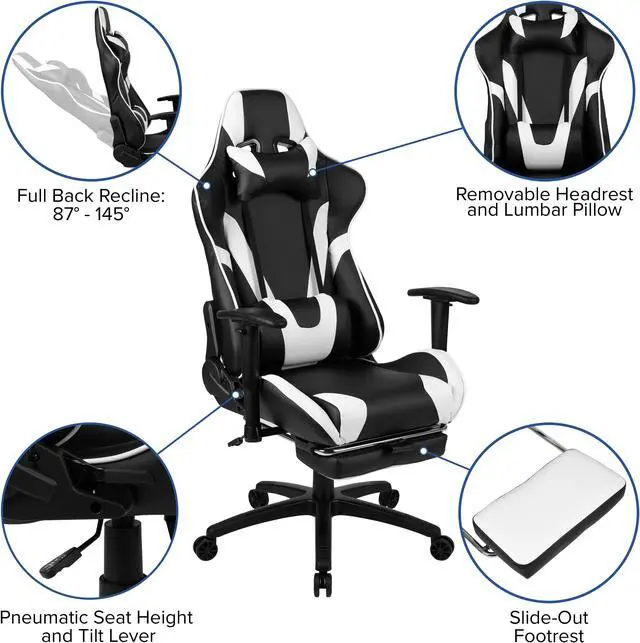 There's a separate lever to recline the back 87° ~ 145° while the lever underneath the seat controls the seat height and locks the chair in an upright position. You'll enjoy endless hours playing your favorite video games on this ergonomic PC chair. Enjoy a good game after work to release the stresses of the day. Slide the footrest out by pulling the loop then flipping the footrest up. Whether you need to lean back just a little or a lot this adjustable back office chair has your back. Complete your gaming experience with our red gaming ergonomic desk with cup holder and headphone hook or black gaming desk with cup holder, headphone hook, and monitor/smartphone stand.