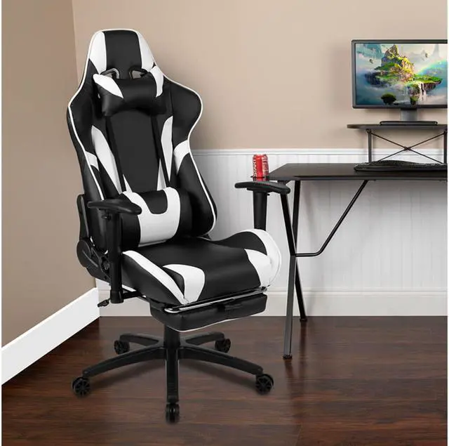 Surpass your game achievements when you are seated comfortably atop this racing gaming chair with extended footrest to properly elevate your feet. Designed to give you the ultimate gaming experience this computer game chair has a reclining back with adjustable lumbar support. If you need support, you have a headrest pillow and lumbar pillow that are adjustable and can be removed by unsnapping while the adjustable pivot arms offer pressure relief from your upper body. Gamers need ergonomic office chairs that'll keep them comfortable for many hours and this reclining gaming chair with adjustable lumbar support will provide optimal support.