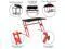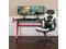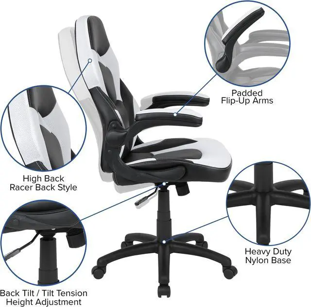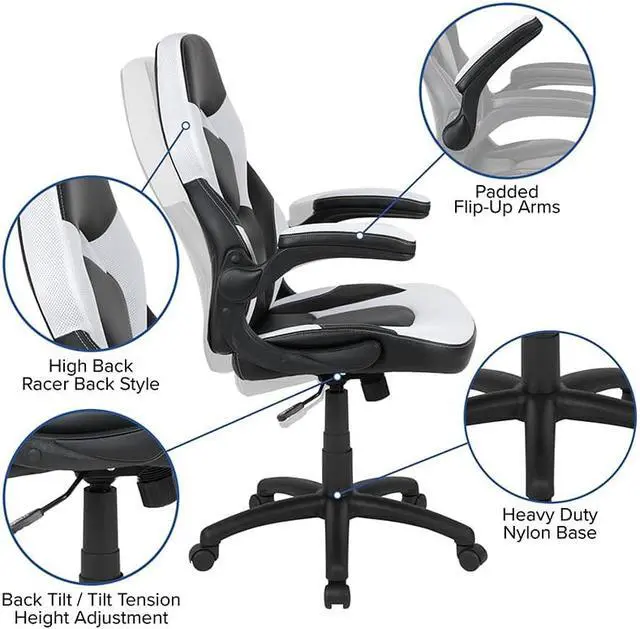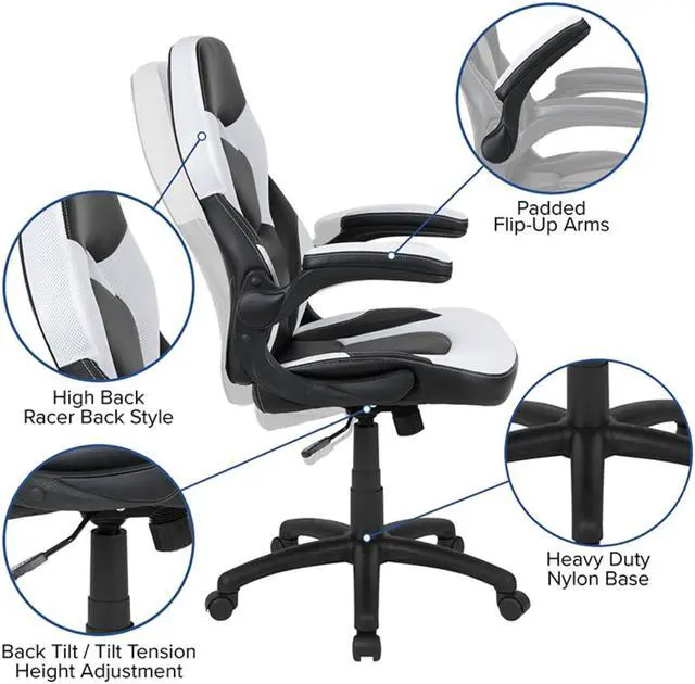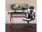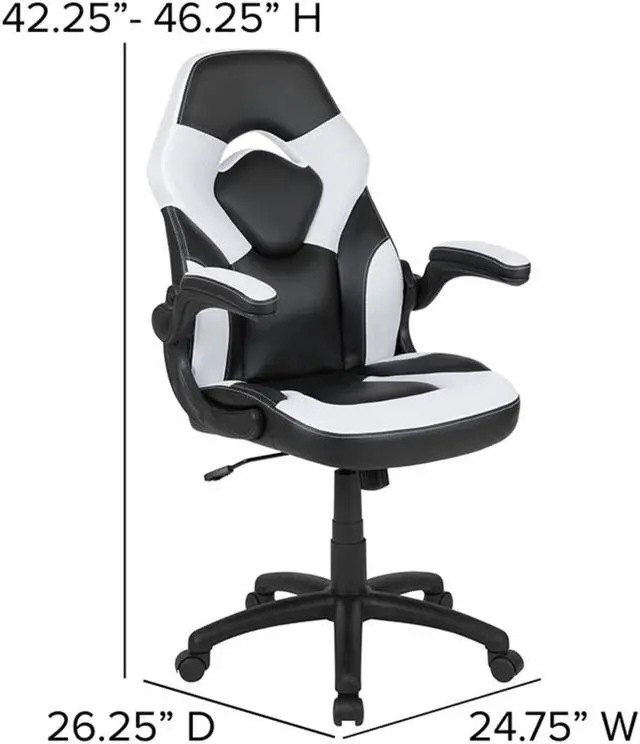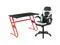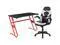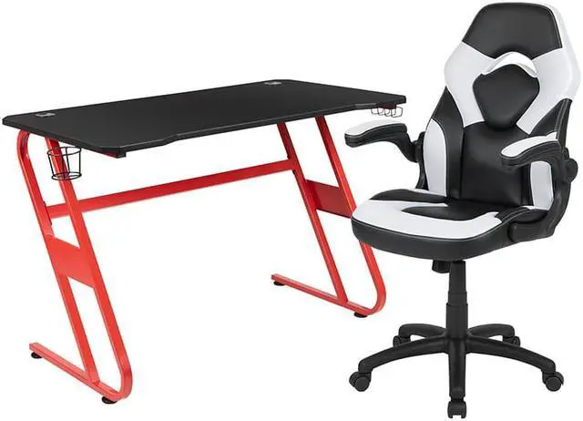 Let the games begin on this gaming desk and chair set. A sleek, red z-frame offers stability and style for a cool looking desk setup. The black top gamers table has two grommets for cable management, a detachable cup holder and headset holder to keep you in game mode. The racing game chair have flip-up arms to comfortably rest your arms on while handling the controller or flip-up to slide under the desk. Be true to the gaming experience with a desk and chair combo designed for gaming systems. A spacious desktop that can hold up to 2 monitors adds more excitement to the game. Use the cup holder to prevent beverages from spilling on your pc gaming keyboard. The comfortably padded ergonomic gaming chair has a full swivel cylinder and adjusts with the pneumatic lever. Tilt back with ease by pulling the lever outward, control the force needed to recline by turning the knob underneath the seat. Made for gamers, this gaming desk and chair bundle will get you on your way to leveling up.