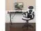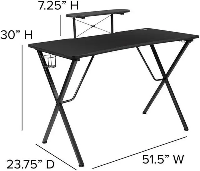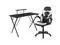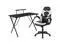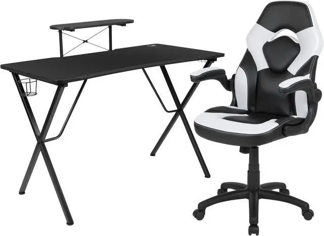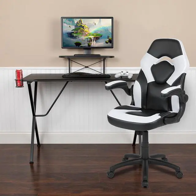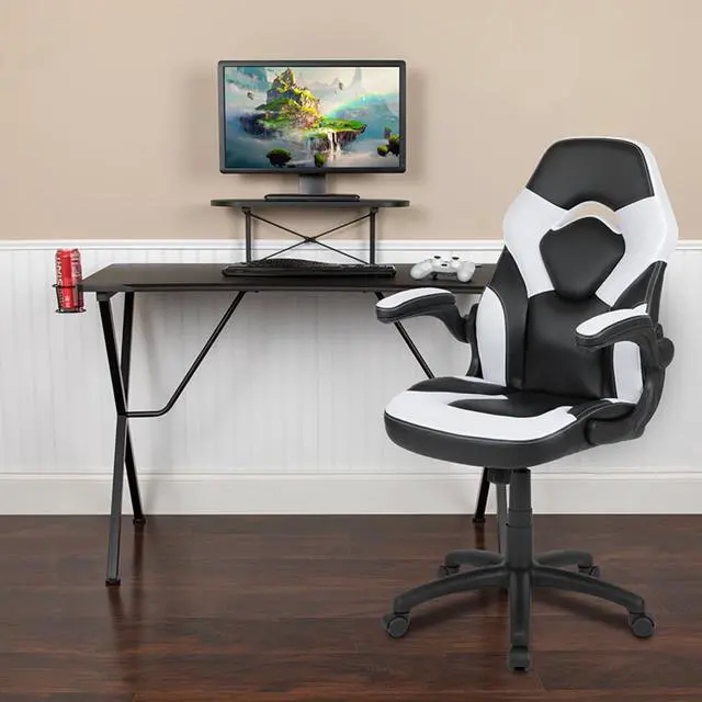 Let the games begin on this gaming desk and chair set. Not only cool to look at but the raised platform keeps your PC monitor at eye level, reducing neck strain. The black top gamers table has a grommet for cable management, a detachable cup holder and headset holder to keep you in game mode. The racing game chair have flip-up arms to comfortably rest your arms on while handling the controller or flip-up to slide under the desk. Be true to the gaming experience with a desk and chair combo designed for gaming systems.