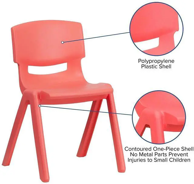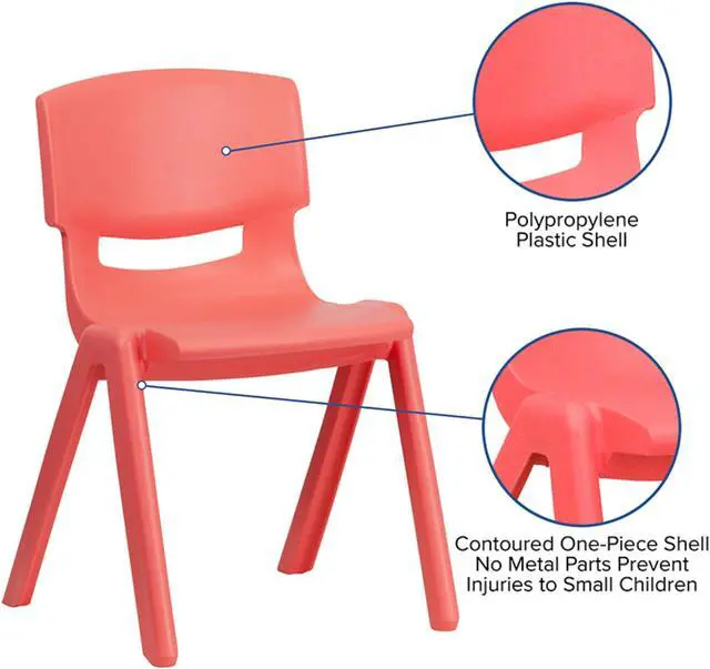 Safeguard your young students with proper classroom chairs that are designed for safety as you provide educational lessons to rambunctious pupils. The one-piece shell chair doesn't have any metal pieces. Boasting a gender-neutral finish, these classroom chairs will focus children on class assignments. Be prepared for play dates by having additional kids chairs in the playroom, kitchen or storage area. The stackable plastic chairs are ideal in the home when extra stack chairs are purchased. Low in maintenance, these school stack chairs wipe clean with ease after arts and craft projects.