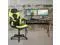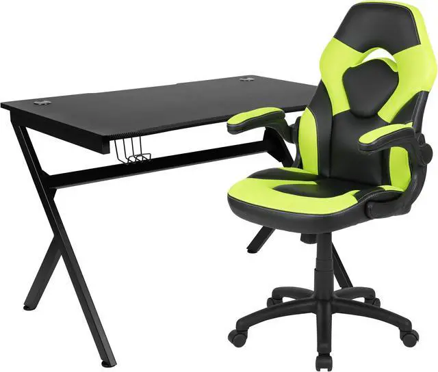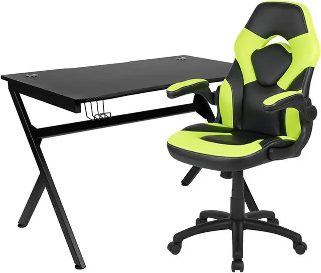 Let the games begin on this gaming desk and chair set. The black top gamers table has 2 grommets for cable management, a detachable cup holder and headset holder to keep you in game mode. The racing game chair have flip-up arms to comfortably rest your arms on while handling the controller or flip-up to slide under the desk. Be true to the gaming experience with a desk and chair combo designed for gaming systems. This PC gaming desk has a spacious, lightweight carbon fiber top that lends superior strength and prevents rust and corrosion while the low thermal expansion properties preserve fiber integrity to extend the lifetime of the desktop.