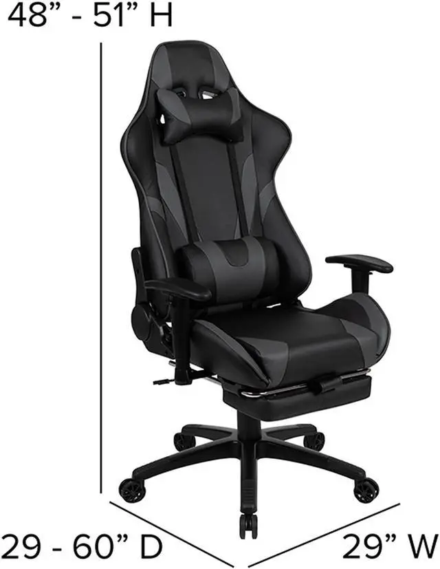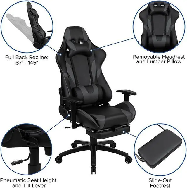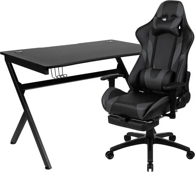 You're going to enjoy playing on this high-performance racing gaming chair with slide-out footrest. This modern gaming chair is paired with an ergonomic gaming desk. If you sit for hours in an office chair you need a gaming chair that is comfortable, and this chair includes adjustable and removable headrest and lumbar pillows. For maximum support this office chair with footrest engages by pulling the loop then flipping the footrest up to elevate your feet and has a separate lever to recline the back 87° ~ 145°. Upgrade your gaming furniture with this desk and chair bundle that offers the perfect combination at an unbeatable price.